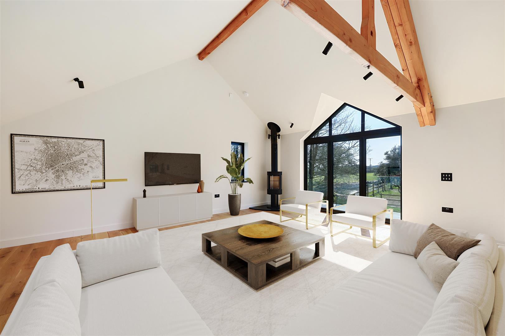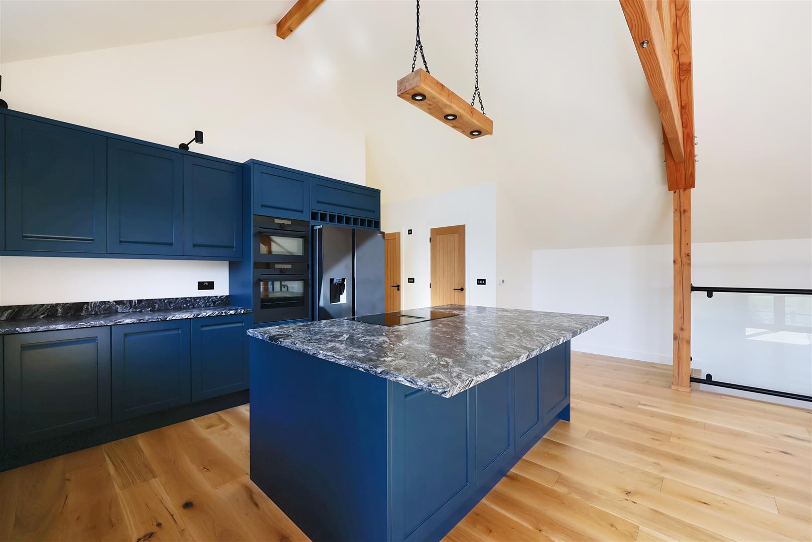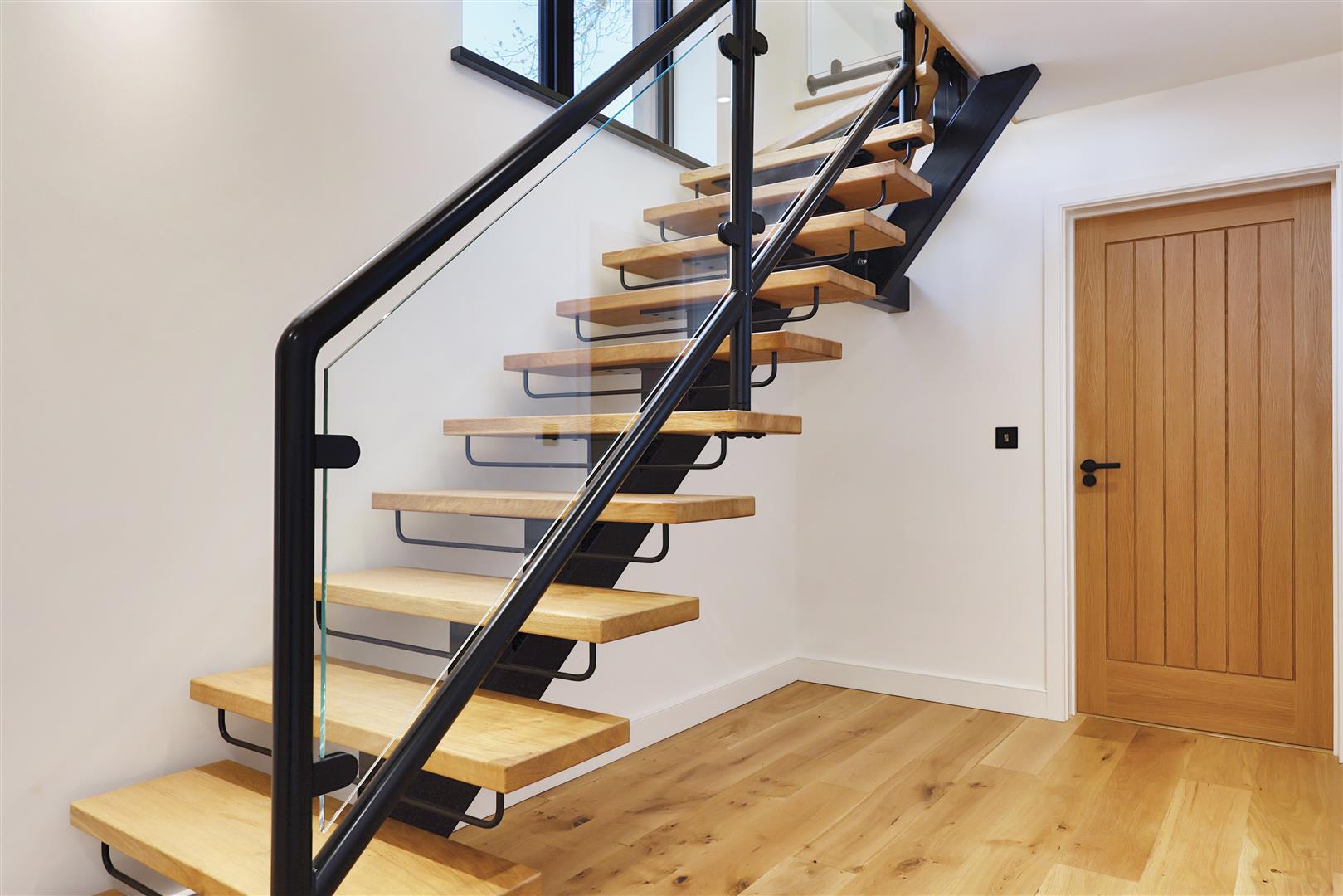 A brand new, contemporary, and stylish five-bedroom property, constructed to the highest standard with impeccable specifications, high-quality finishes, appliances, and underfloor heating throughout. Entering via the private driveway, the Siberian larch-clad exterior and green oak porch-way complement the modern design, creating an attractive and welcoming entrance. A spacious hallway provides a lovely introduction to the home, featuring engineered oak flooring and a bespoke staircase leading up to the open-plan kitchen/dining/living space.