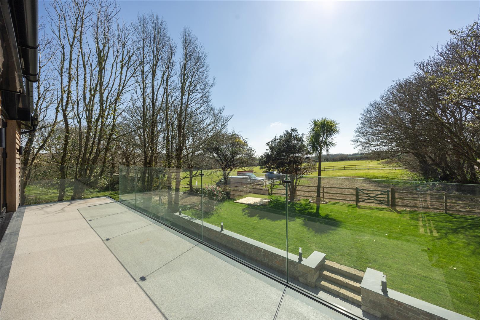 Downstairs, the master bedroom suite is generously proportioned and opens out onto the rear garden. The two further en-suite bedrooms are finished to the same high standards. This level also offers a further bedroom or study, along with a family bathroom and a utility room. Outside, a wide, paved driveway provides ample parking for four or more cars. Additionally, there is a very spacious two-storey double garage, offering plenty of room for cars, storage, or the potential for a studio space. To the south of the property, a sunken patio area provides a lovely space to relax and entertain. This area seamlessly blends into a good-sized lawn, lined with established trees, and offers stunning views across the Cornish countryside.