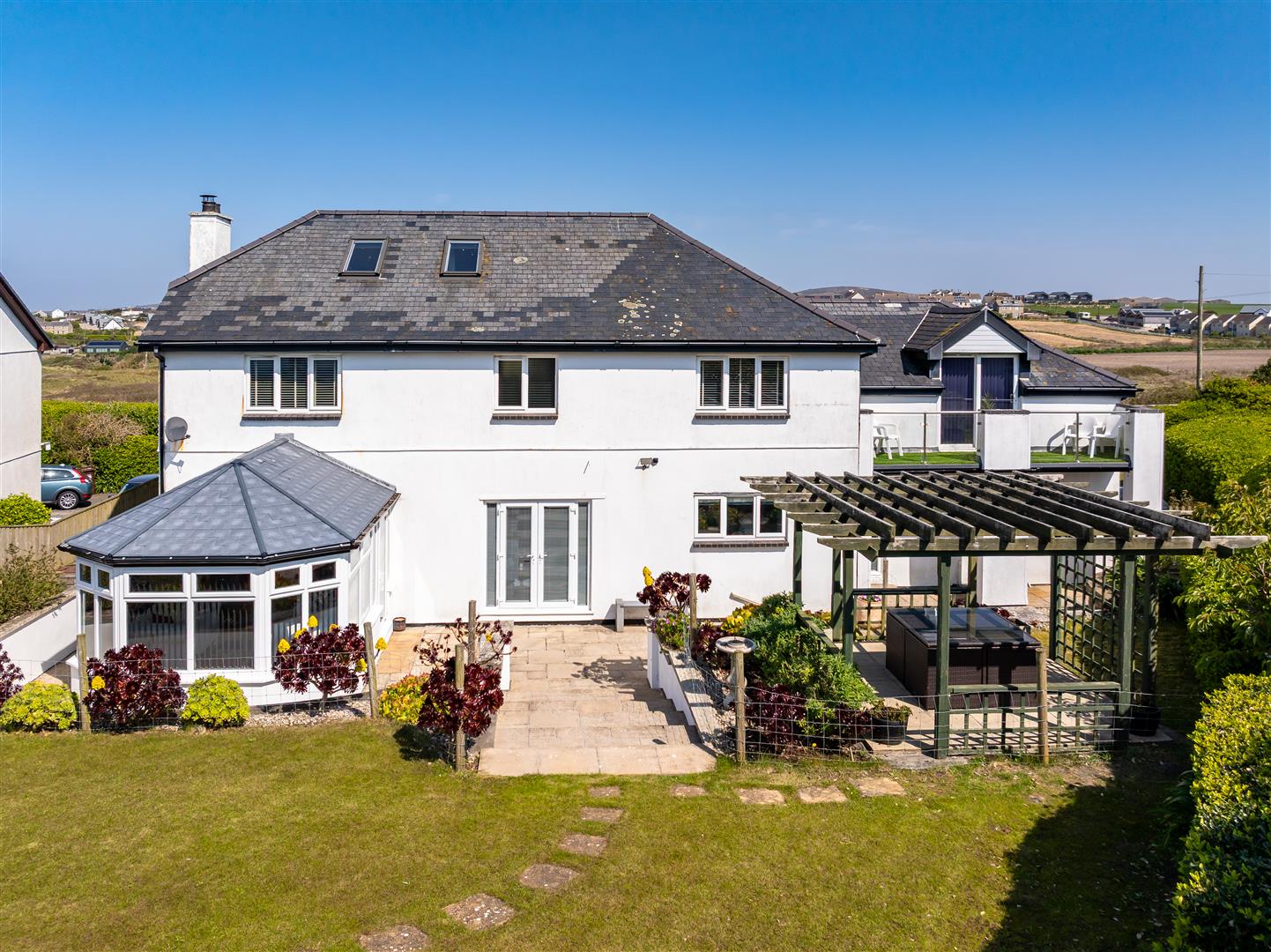The rear gardens are a particular feature of the property, being south-facing and thoughtfully landscaped with a generous lawn bordered by exotic planting including palms and succulents. A large patio with pergola provides a sheltered and sunny space, ideal for outdoor dining and entertaining.