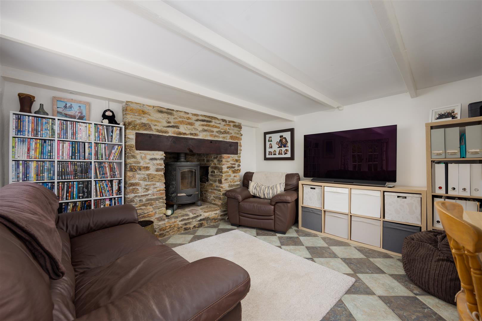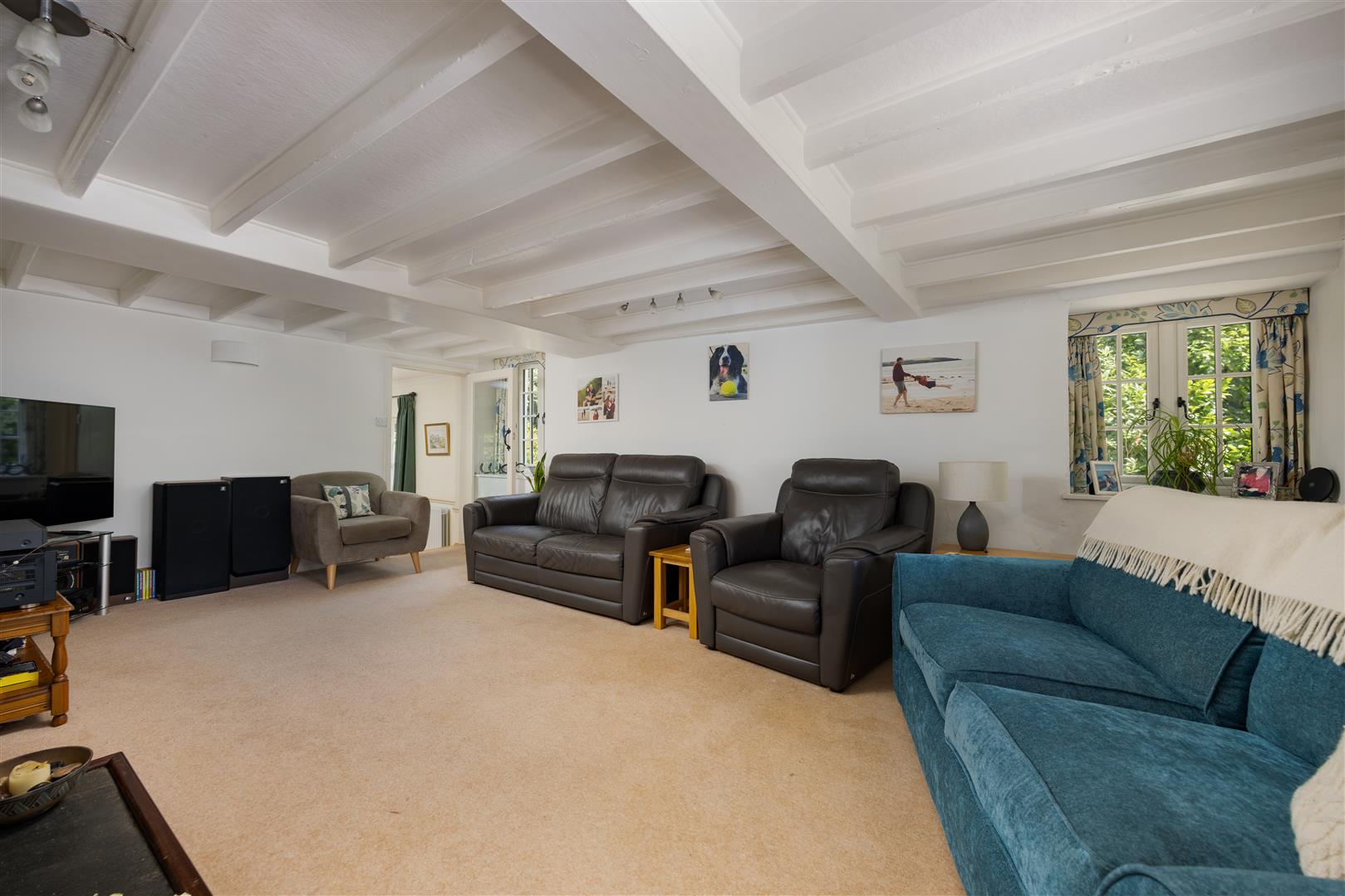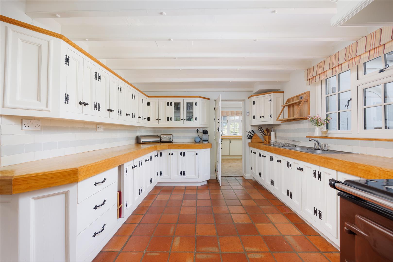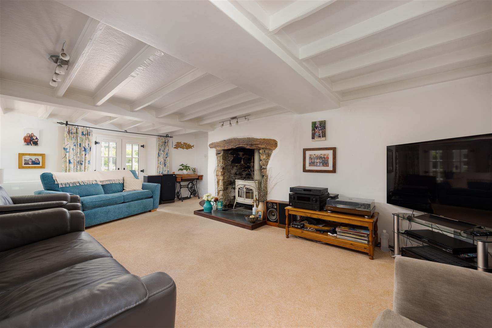 The main residence is larger than it first appears, offering generously proportioned and versatile accommodation. A welcoming entrance hall with flagstone slate flooring and a magnificent inglenook fireplace with wood-burning stove sets the tone, giving access to the kitchen, sitting room, and snug, as well as the staircase. The spacious sitting room features an attractive fireplace and leads into a formal dining room overlooking the rear gardens—perfect for entertaining—which in turn connects to the 23-foot L-shaped kitchen/breakfast room. The kitchen forms the heart of the home, with a five-door AGA, bespoke cabinetry, beamed ceiling, terracotta tiled flooring, and French doors opening directly to the gardens. A characterful snug with views over the front lawns completes the reception rooms.