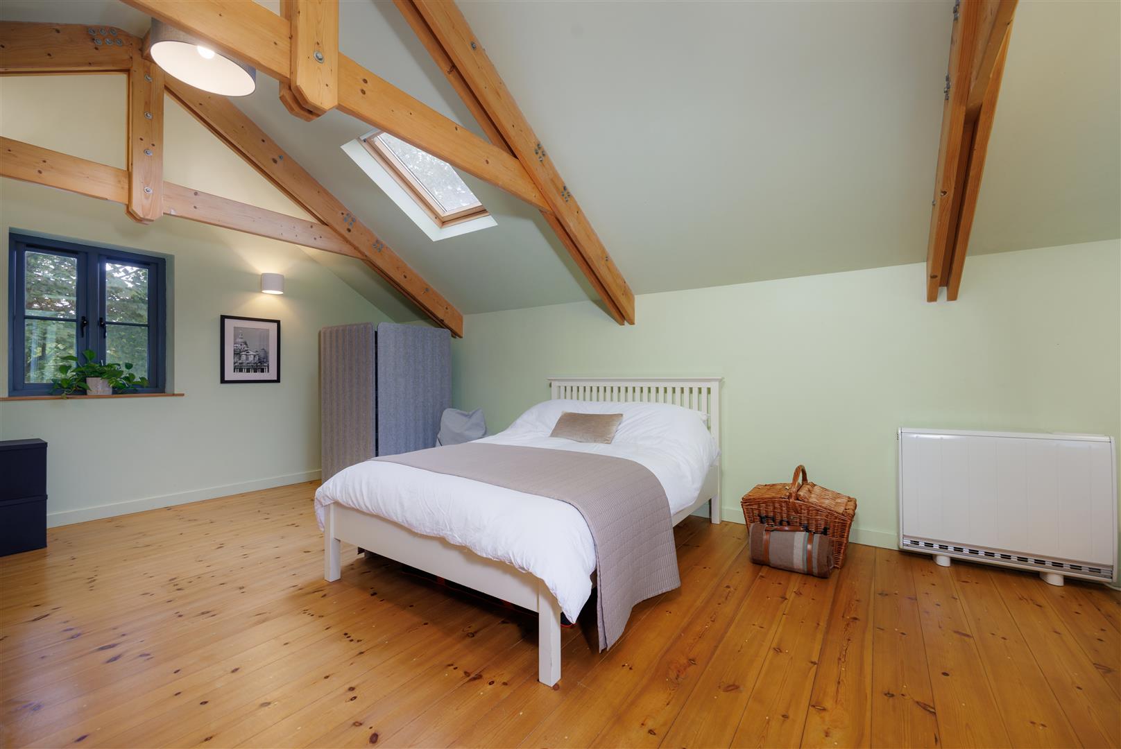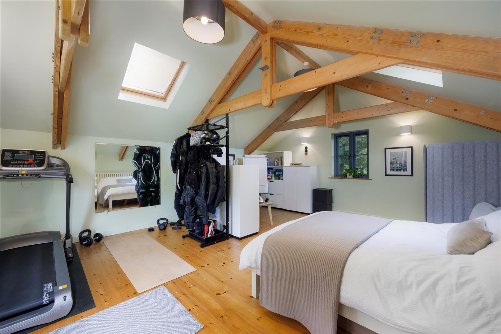 Outside, a substantial studio space measuring approximately 19’9” x 16’5” sits above the double garage. Featuring vaulted ceilings and exposed beams, this room is currently arranged as an attractive additional bedroom and working from home space but offers potential for a variety of uses. In addition, there is a further attached outbuilding, currently used for storage, which presents scope for development (subject to any necessary planning consents).
