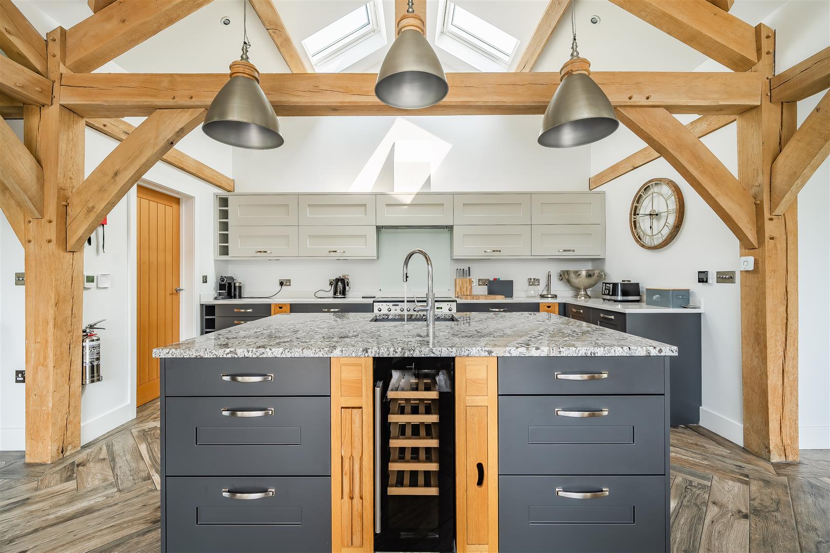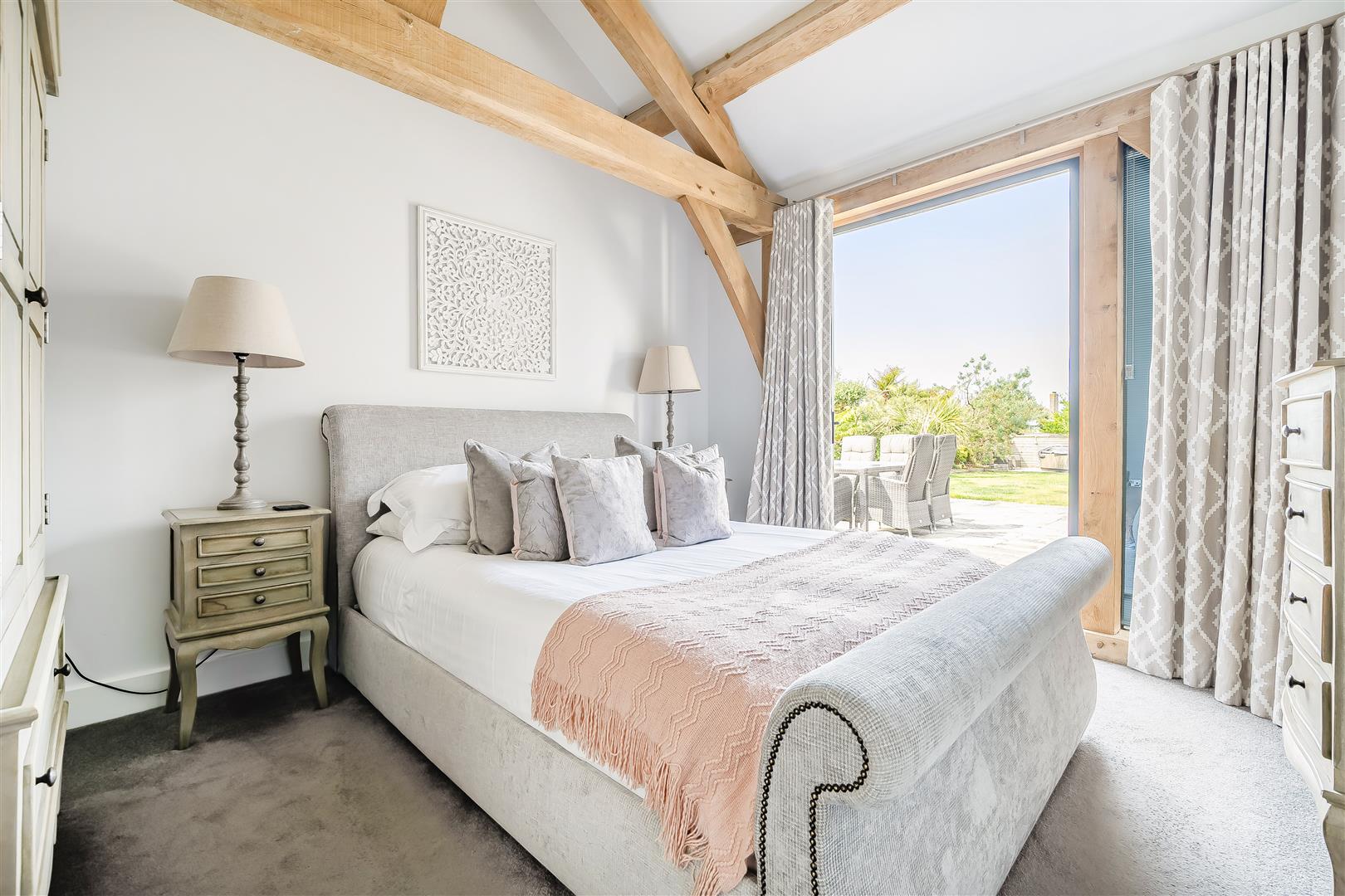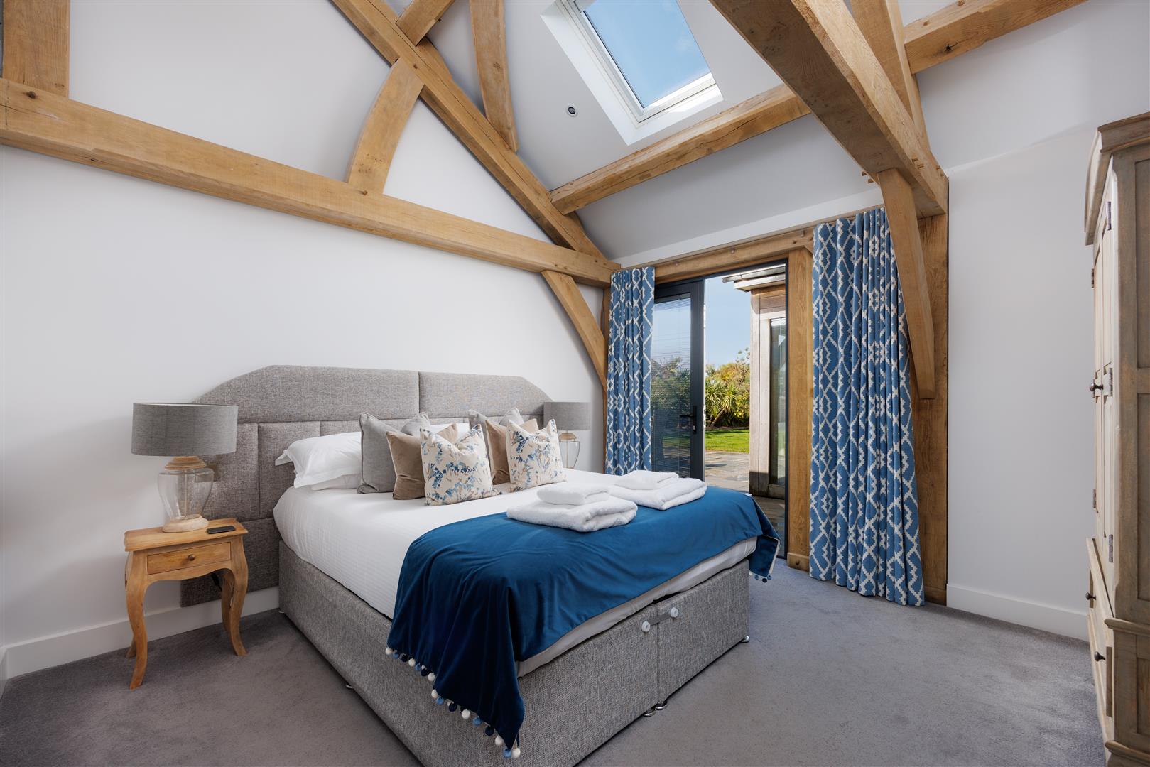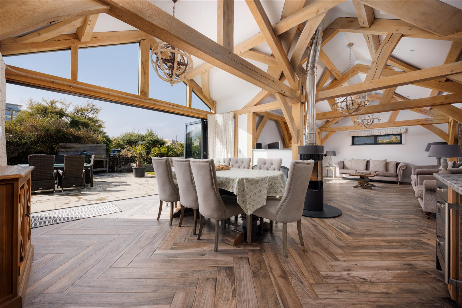 Inside, the interiors achieve a flawless balance of modern sophistication and relaxed seaside charm. Soaring vaulted ceilings and exposed substantial timber beams create an immediate sense of drama and scale, while extensive glazing, including bi-folding doors allows natural light to flood the generous living spaces. The open-plan kitchen, dining, and lounge areas flow seamlessly, forming a bright and uplifting environment equally suited to family living or entertaining on a grand scale.