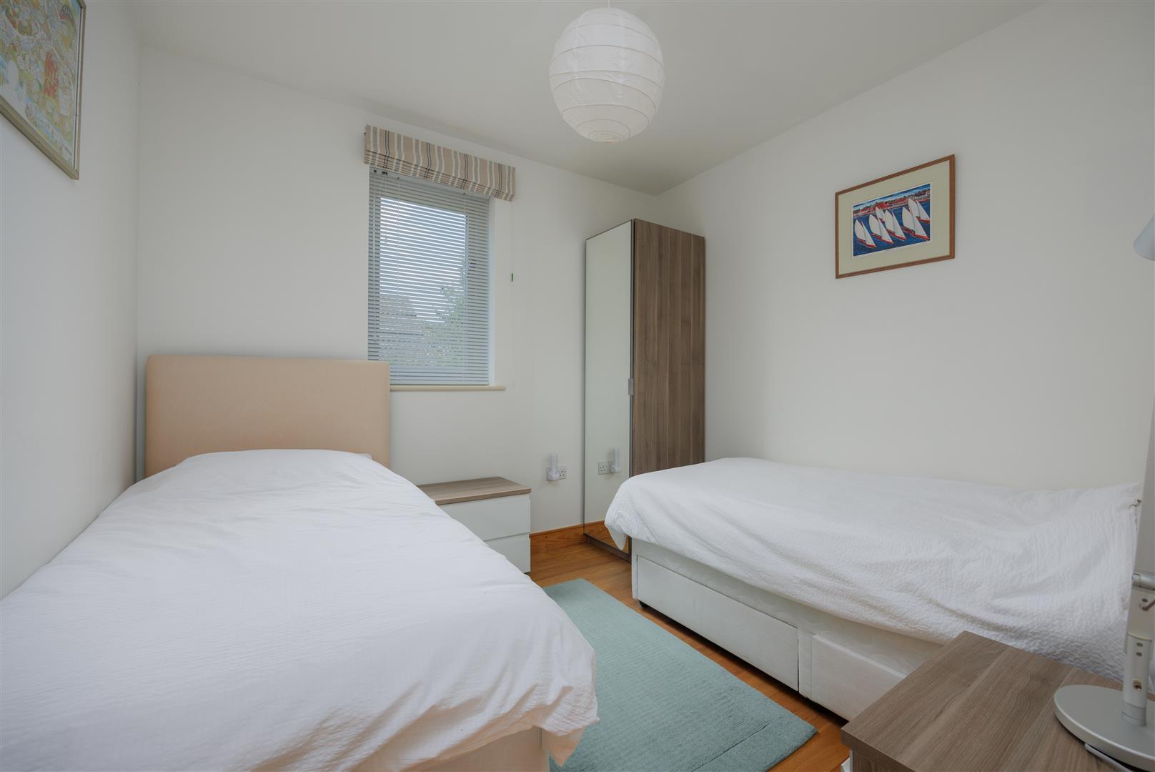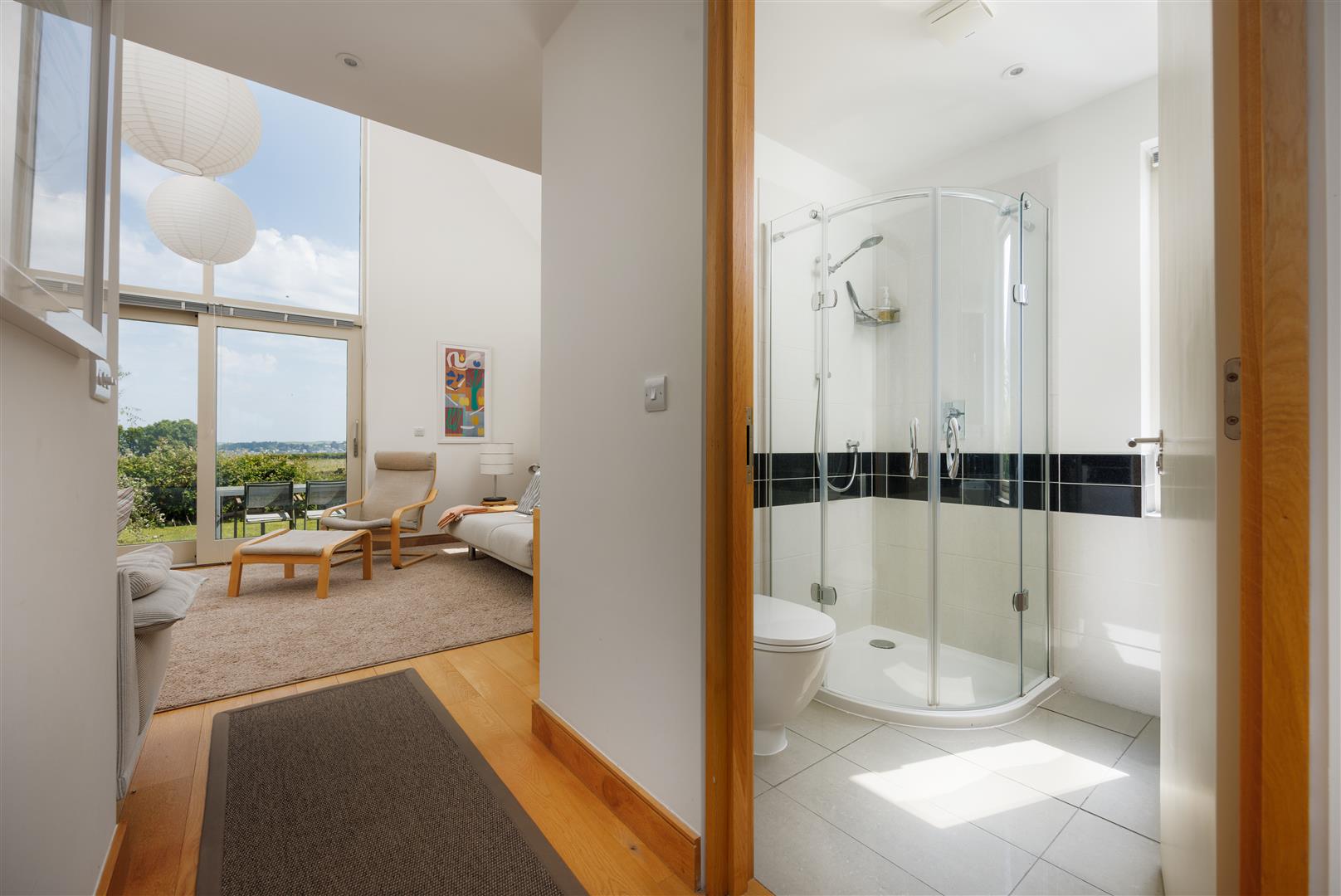 Upstairs, there are two excellent en suite bedrooms. The principal suite enjoys a southerly aspect, fitted wardrobes, and a contemporary en suite bathroom. Bedroom 2 occupies a striking mezzanine position above the sitting room, enjoying elevated views towards the estuary and Rock, together with built-in wardrobes and an en suite shower room. The first floor continues the wide-planked engineered wood flooring and underfloor heating, ensuring comfort throughout.