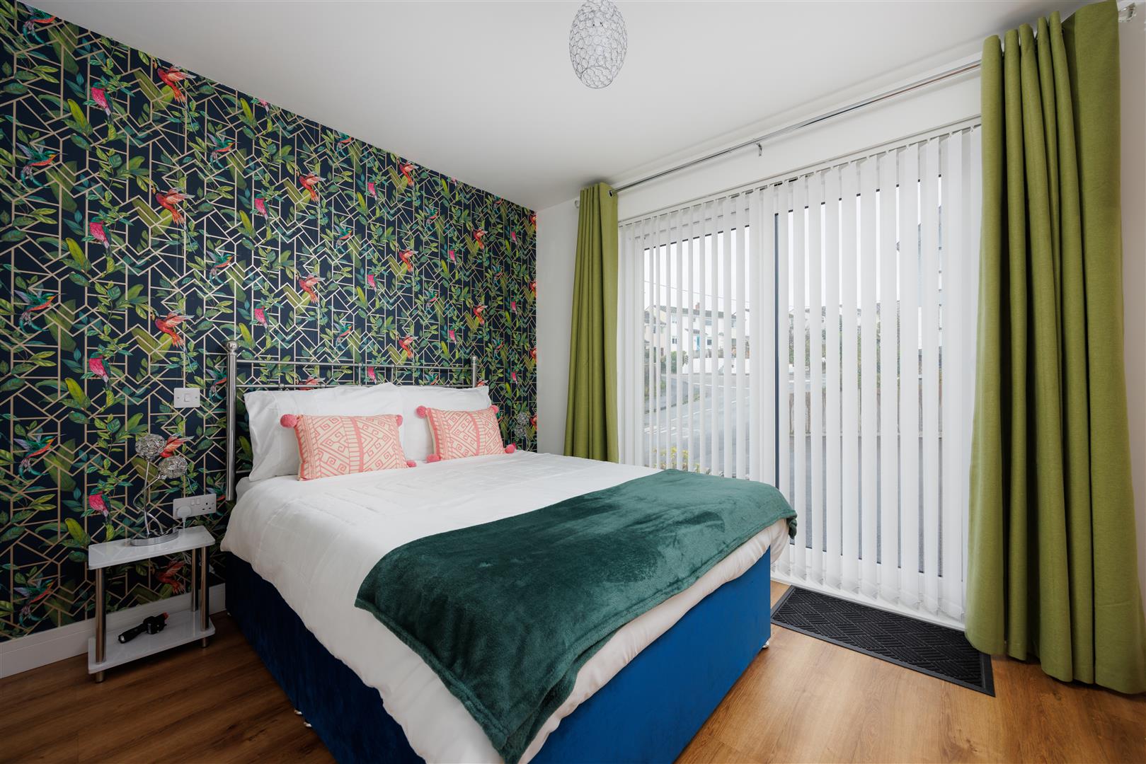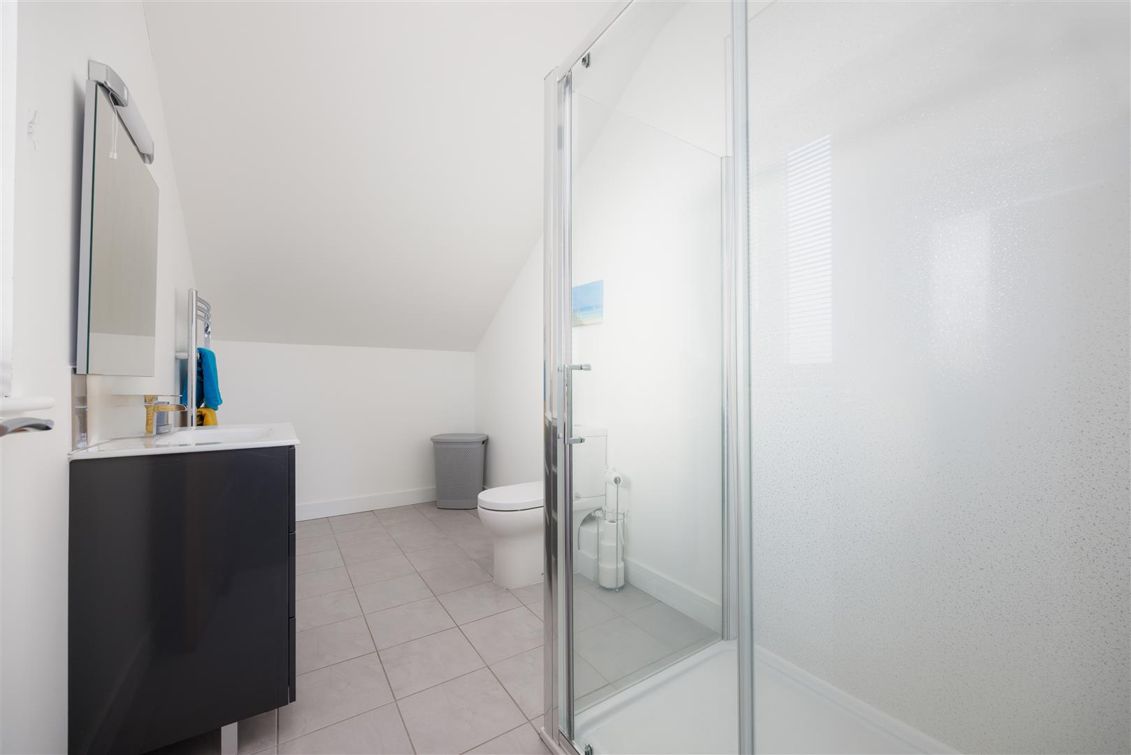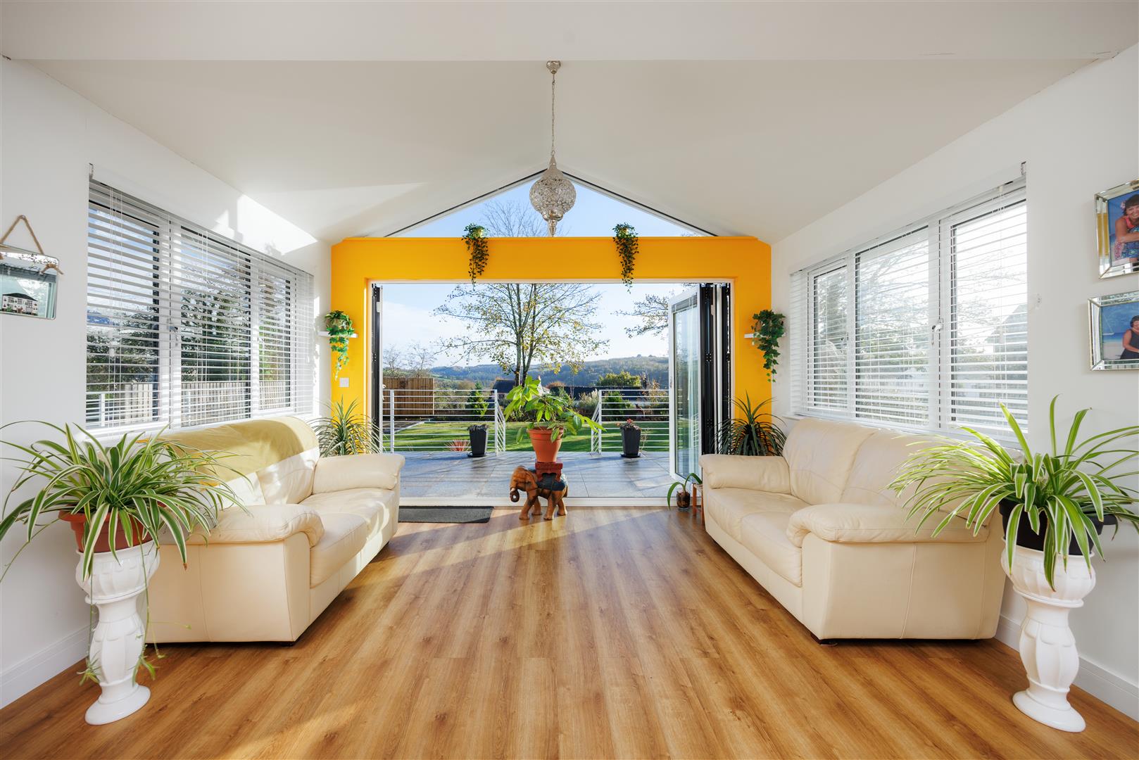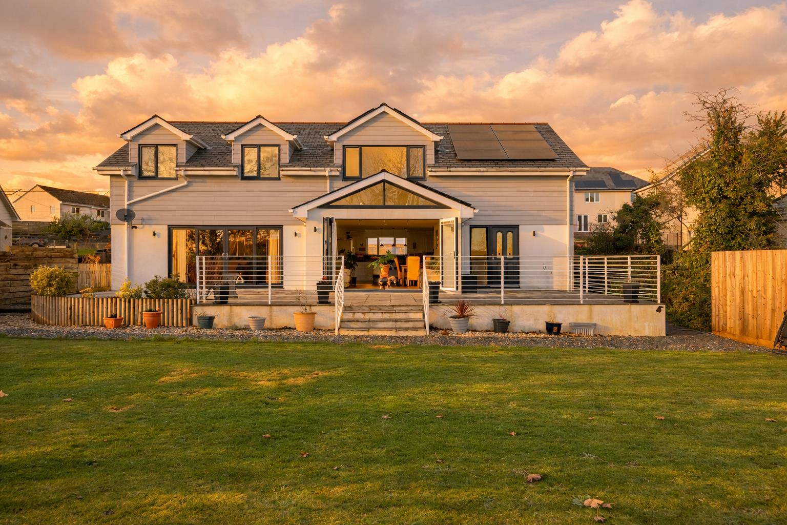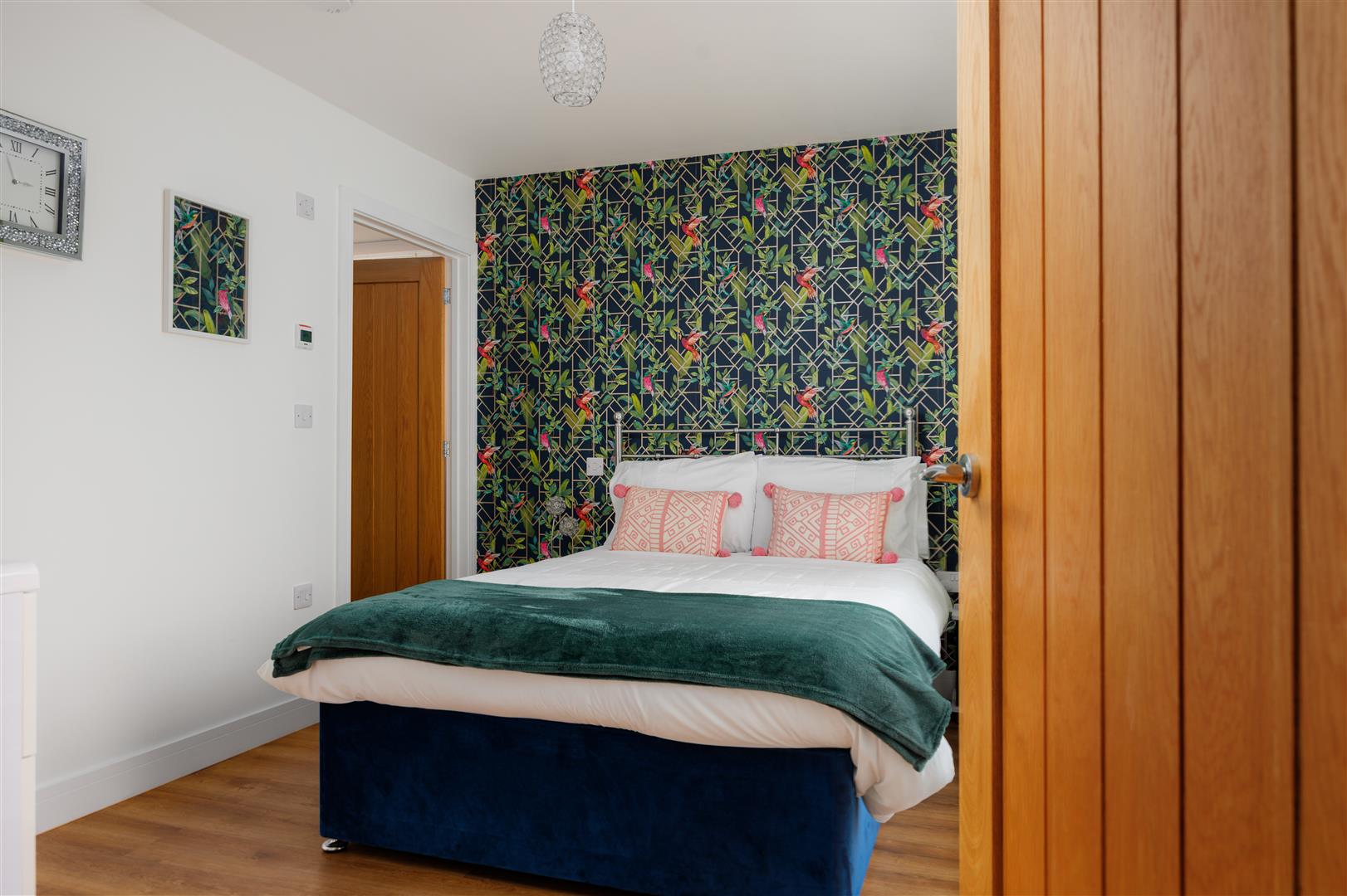 The dual-aspect 22' lounge is accessed via glazed double doors from the kitchen. It is bathed in natural light and enjoys sliding doors directly onto the terrace, making it the perfect space to relax and take in the surroundings. A ground-floor double bedroom suite with sliding patio doors to the front and en suite shower room completes the ground floor, offering flexibility for guests or multi-generational living.