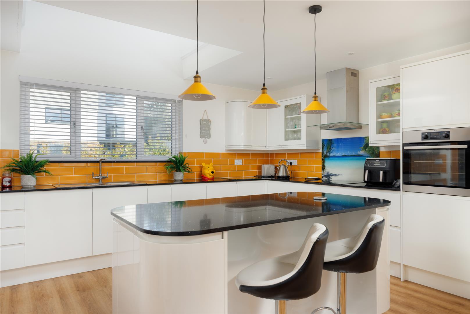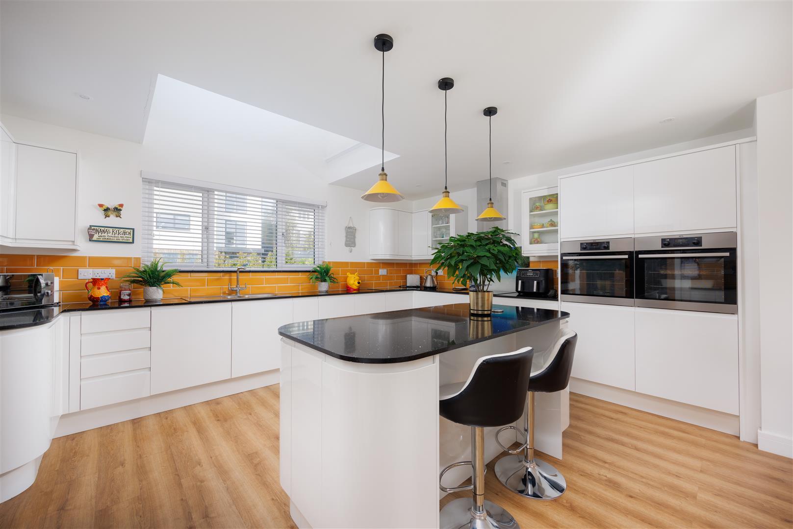 Completed in 2020 to a high specification, the property enjoys a bright south-facing aspect and a thoughtfully designed layout. A spacious entrance porch opens into the striking galleried reception hall, featuring a vaulted ceiling, solid oak staircase, and feature landing. The heart of the home is the impressive 35’ open-plan kitchen, dining, and family room. Large bi-fold doors and a gabled window frame the views and flood the space with natural light, while opening onto the south-facing terrace and garden for seamless indoor-outdoor living. A part-vaulted ceiling enhances the sense of space, complemented by a sleek, handleless contemporary kitchen with contrasting black quartz worktops, premium AEG appliances, extensive storage, and a breakfast bar. The adjoining dining area comfortably accommodates a large table, and the sitting area enjoys the best of the views. Beyond is a good-sized utility room with WC, as well as doors providing access to the rear terrace and the integral garage.