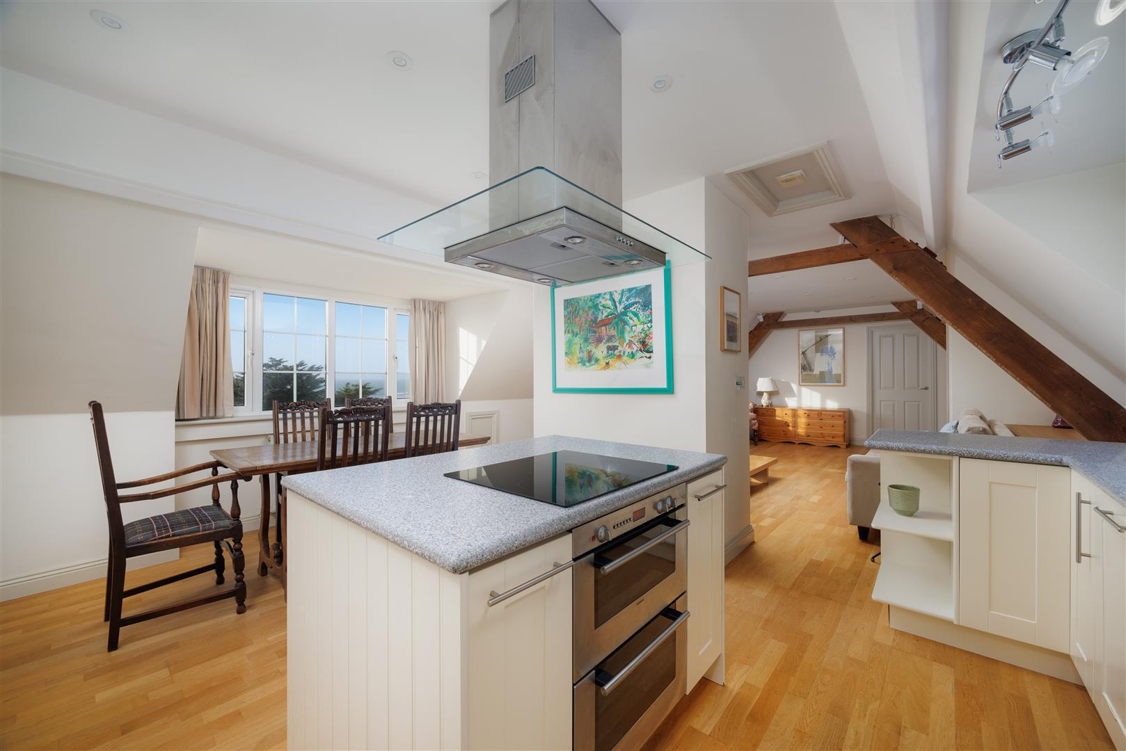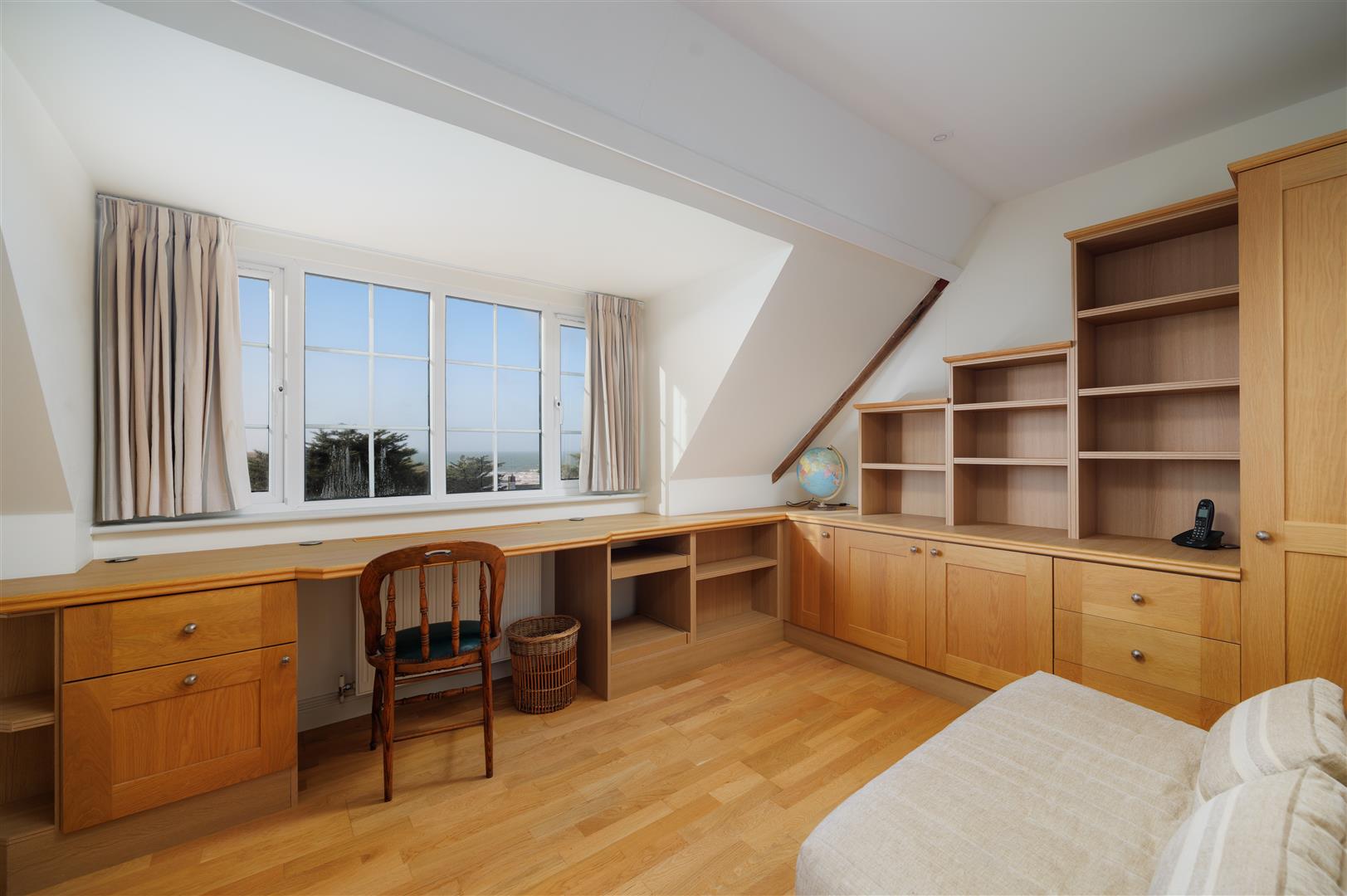 The principal bedroom suite offers sweeping sea views, a good-sized dressing area with a range of built-in wardrobes, and a spacious en-suite bathroom. The second double bedroom also benefits from striking vistas and a en-suite shower room.