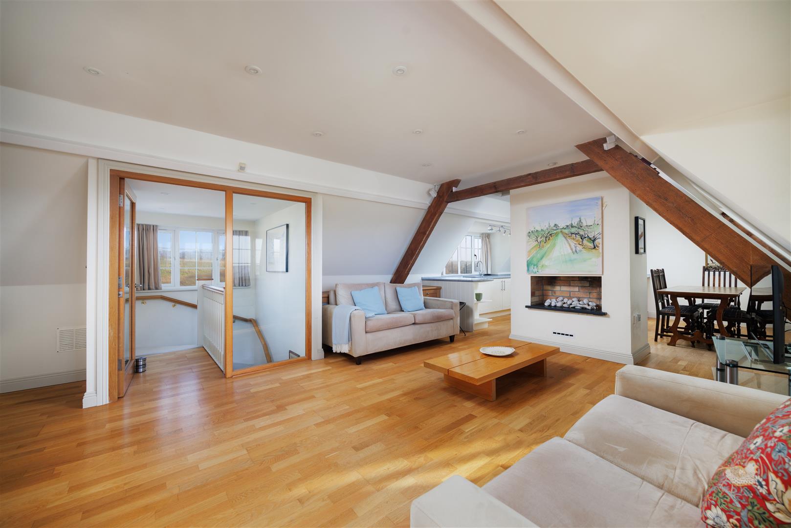 At the heart of the home, the open-plan kitchen, dining, and living space stretches over 29 feet, flooded with natural light from dual-aspect east and west facing windows. Exposed beams, wood flooring, and a fireplace provide the space with both a warmth and character — an inviting environment for entertaining, unwinding after a day on the beach, coastal paths or after a round at the links.