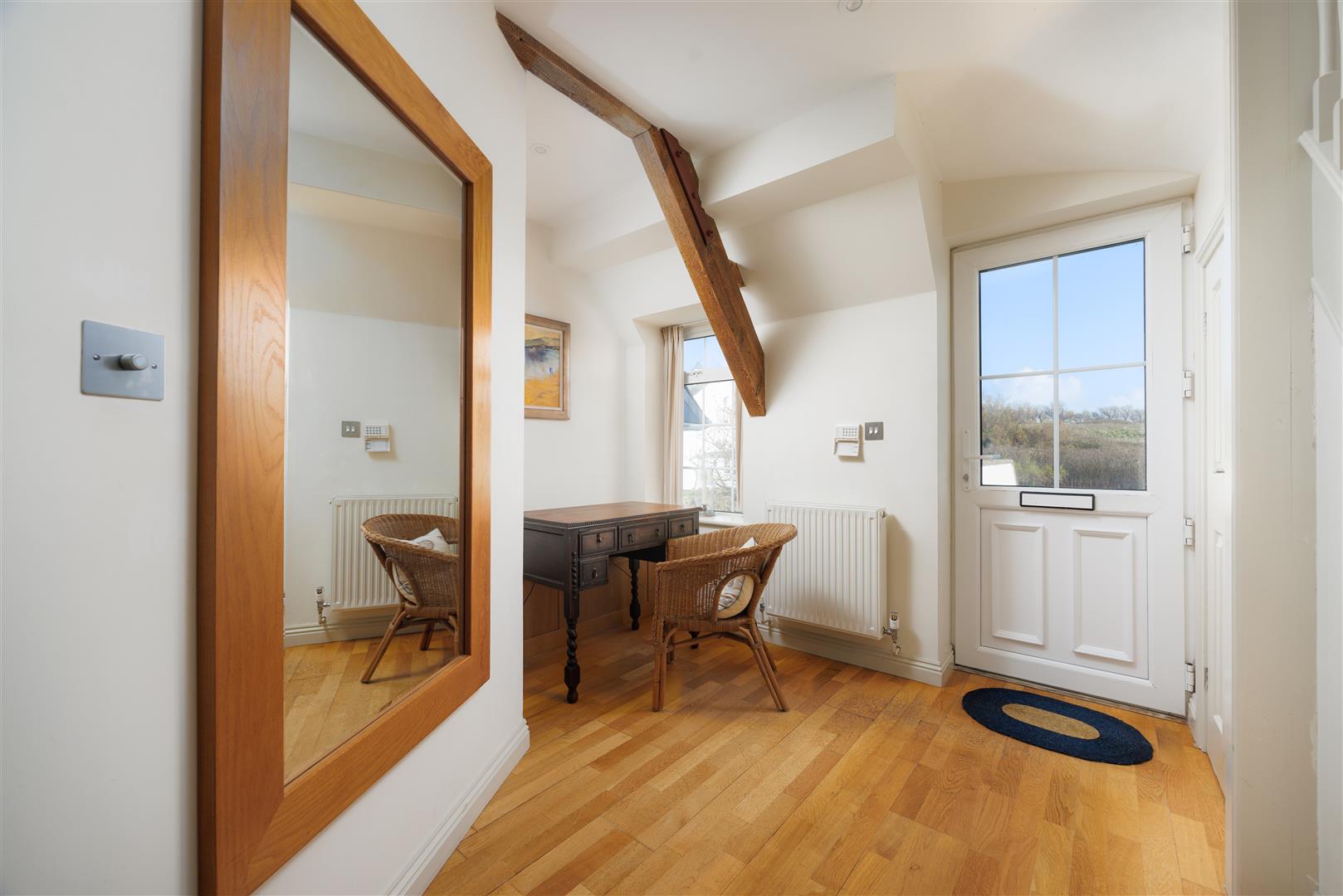 A flight of steps leads from the private walled garden and parking area to a welcoming entrance hall, which provides access to two well-appointed bedrooms and the staircase to the upper floor. The top level houses the principal living spaces and a versatile third bedroom or home office, and a bathroom for convenience.
