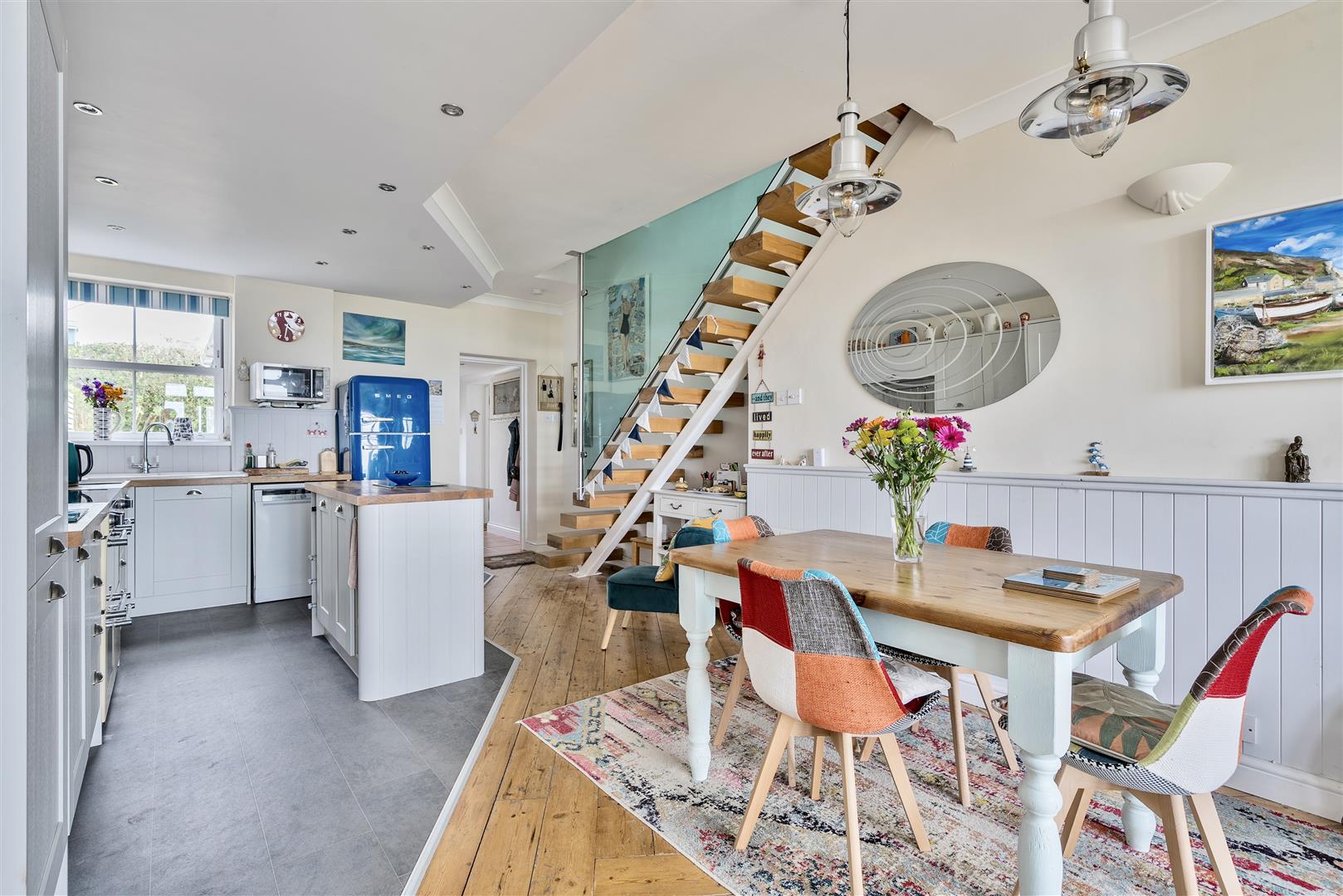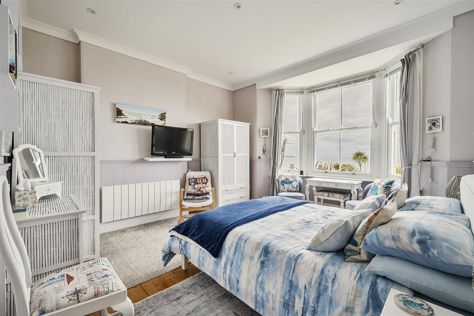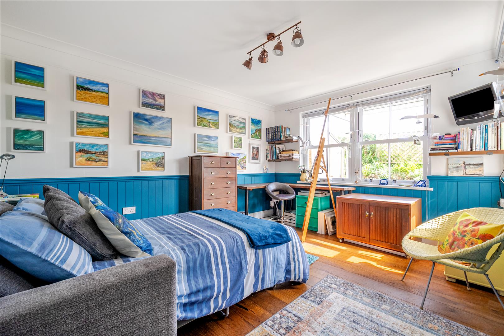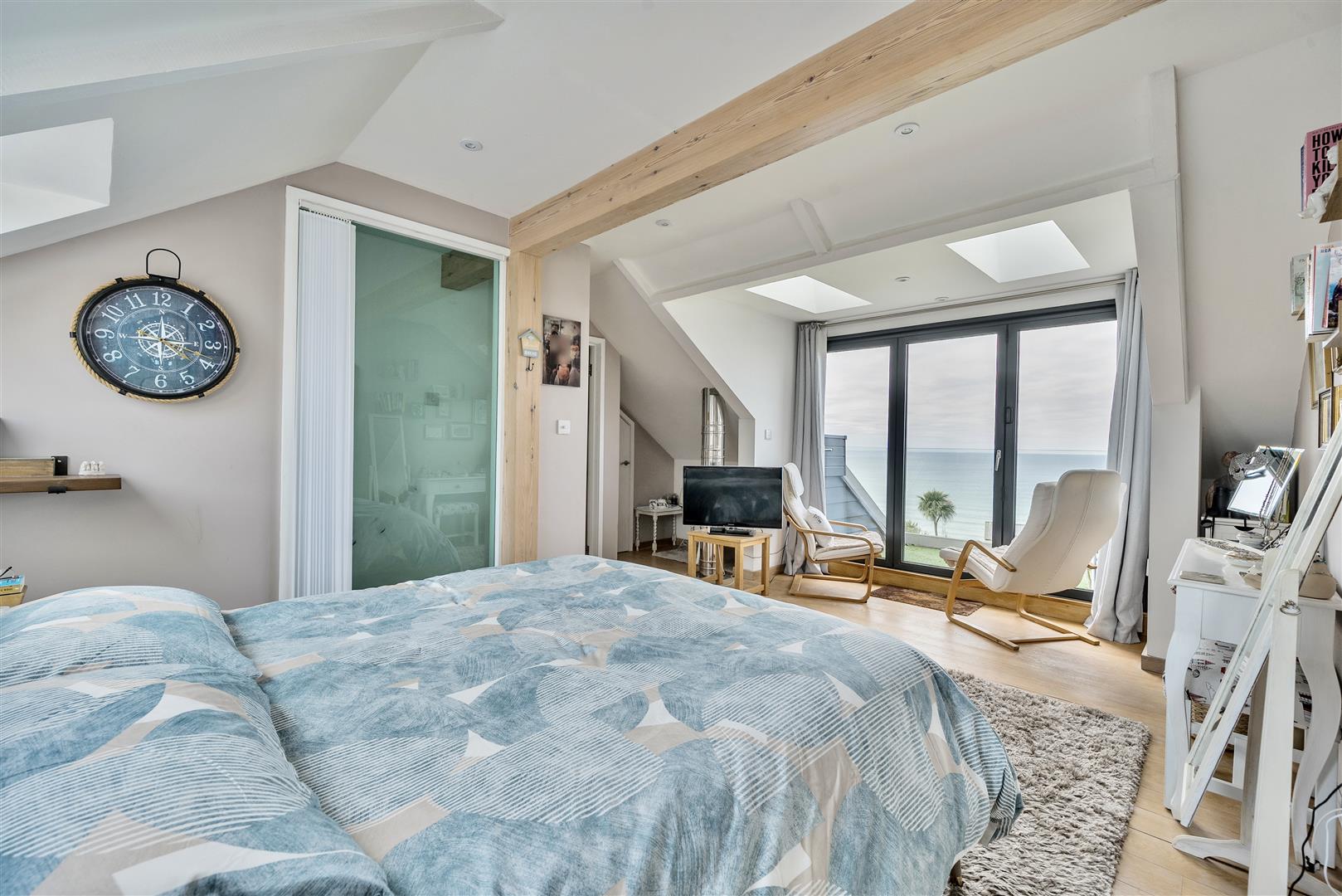 At the heart of the home is a bright, dual-aspect kitchen and living room (9.0m x 4.08m), designed for both everyday living and entertaining with a cosy woodburner. Patio doors open onto the decked terrace, allowing natural light to flood the space while perfectly framing the panoramic sea views.The spacious sitting room features a bay window that makes the most of the outlook, together with a wood-burning stove for cosy evenings. To the rear, an open study provides an ideal home office or hobby area, while two well-proportioned bedrooms are served by a stylish family bathroom. The principal suite occupies the entire first floor, benefiting from the finest vantage point in the house with access to a private balcony. This luxurious space is complemented by a generous en suite bathroom and a dedicated dressing room. To one side of the property, a self-contained guest suite finished to the same high standard as the main house, offers flexible accommodation. It is currently arranged as a utility room, sitting room and a sea-view bedroom with bathroom.