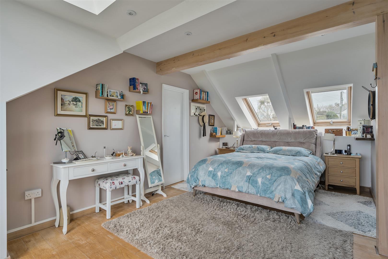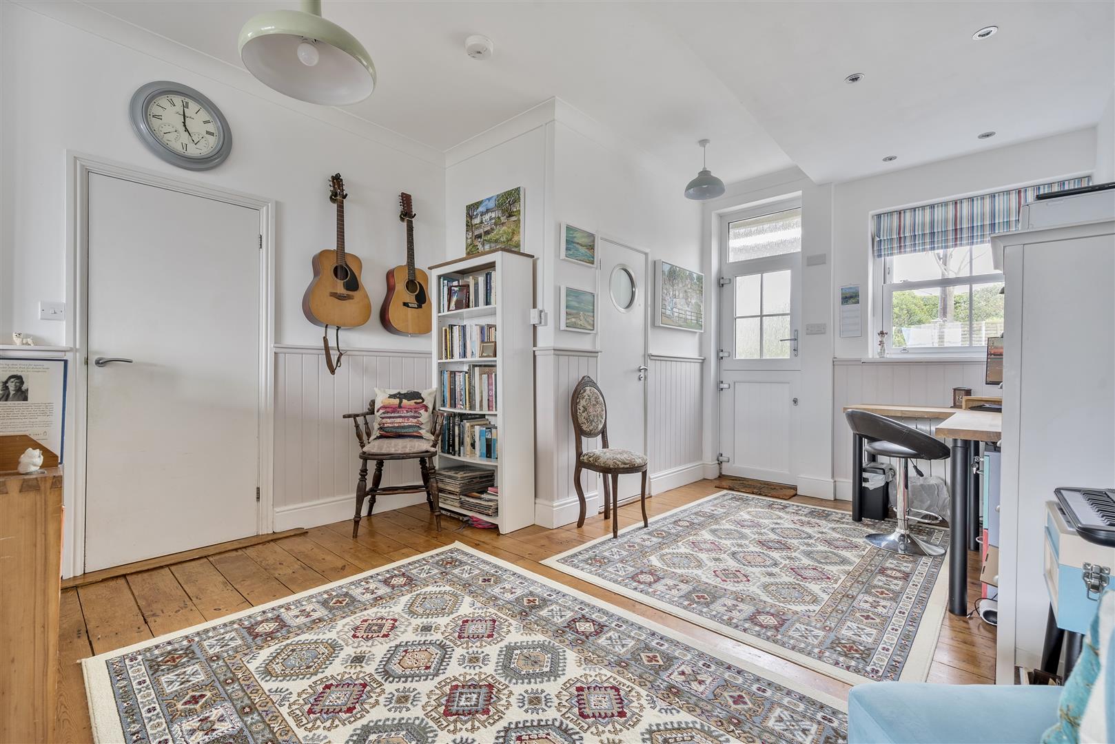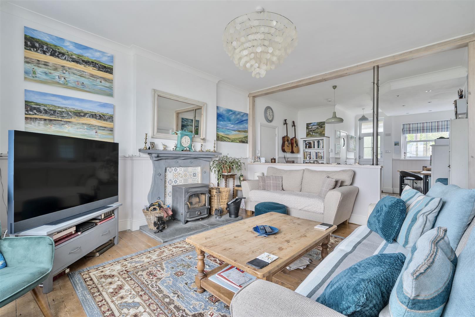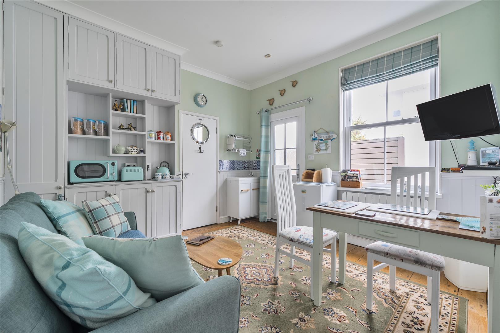 At the heart of the home is a bright, dual-aspect kitchen and living room (9.0m x 4.08m), designed for both everyday living and entertaining with a cosy woodburner. Patio doors open onto the decked terrace, allowing natural light to flood the space while perfectly framing the panoramic sea views.The spacious sitting room features a bay window that makes the most of the outlook, together with a wood-burning stove for cosy evenings. To the rear, an open study provides an ideal home office or hobby area, while two well-proportioned bedrooms are served by a stylish family bathroom. The principal suite occupies the entire first floor, benefiting from the finest vantage point in the house with access to a private balcony. This luxurious space is complemented by a generous en suite bathroom and a dedicated dressing room. To one side of the property, a self-contained guest suite finished to the same high standard as the main house, offers flexible accommodation. It is currently arranged as a utility room, sitting room and a sea-view bedroom with bathroom.