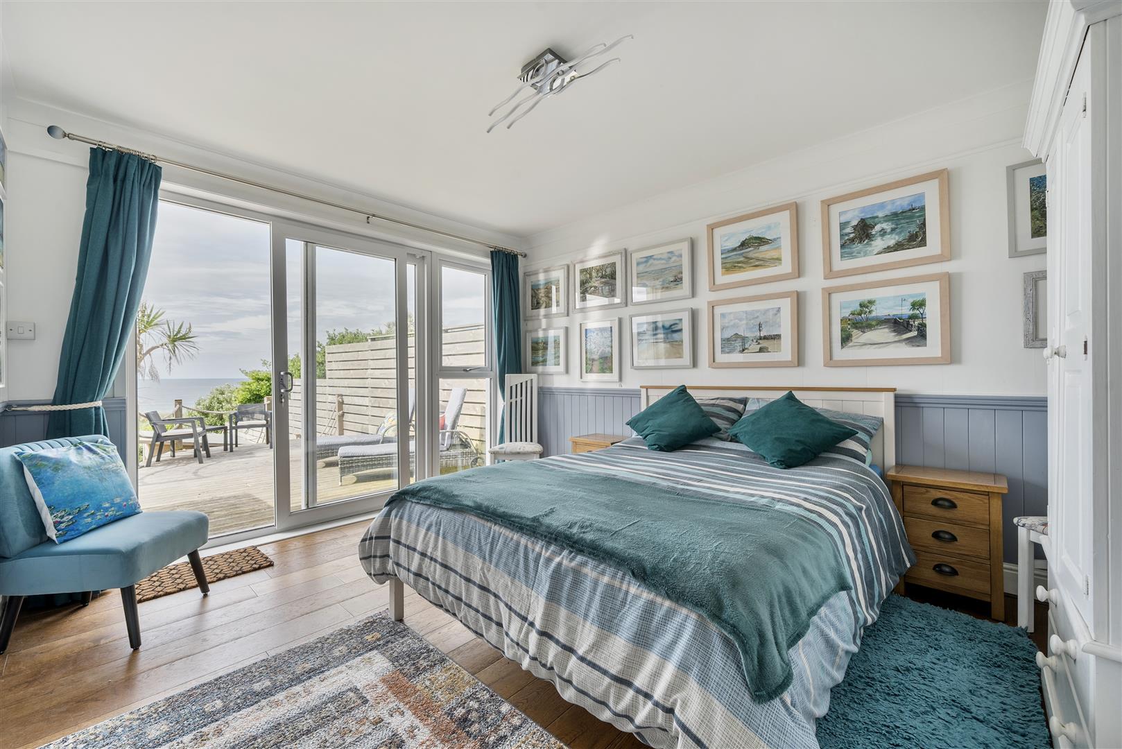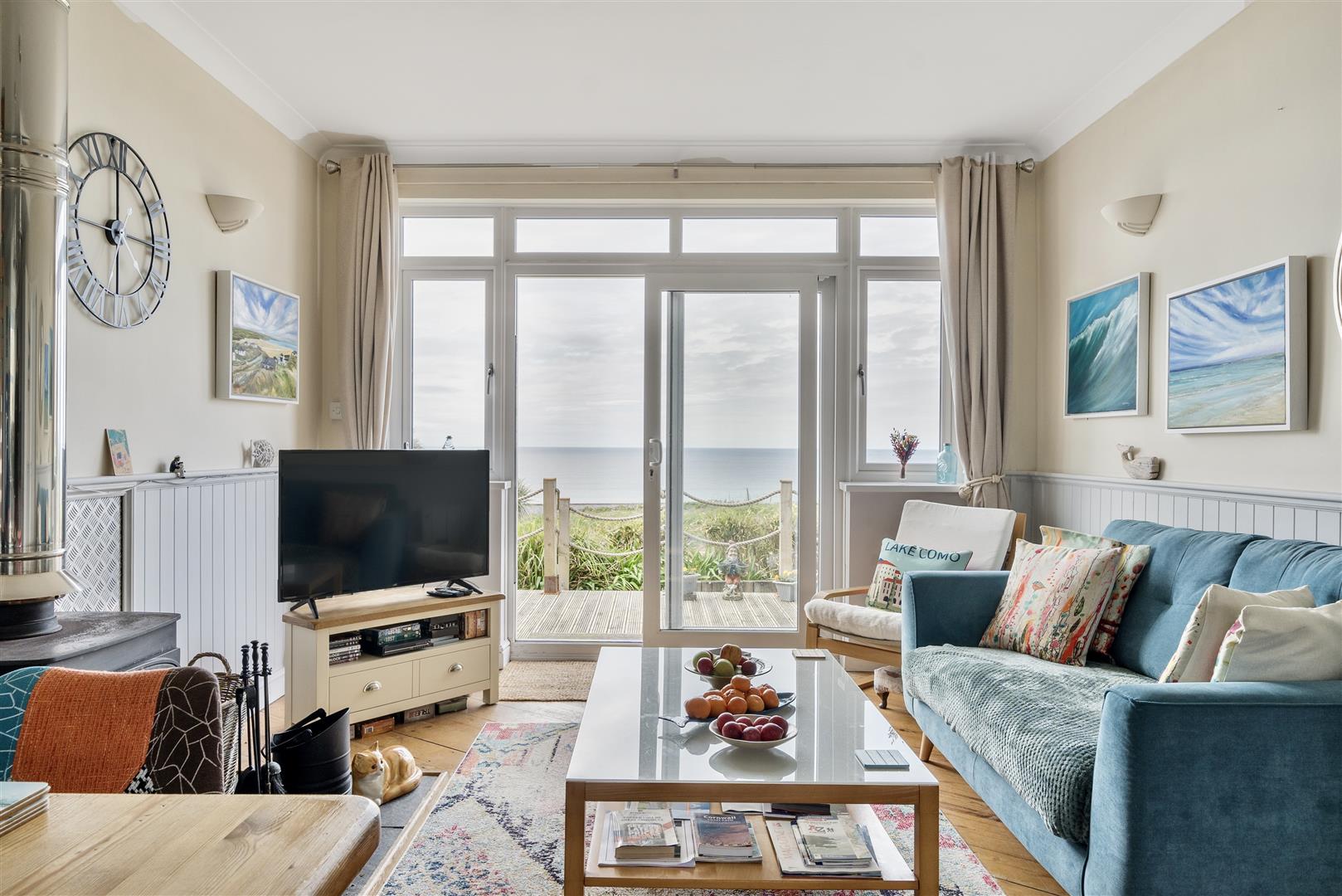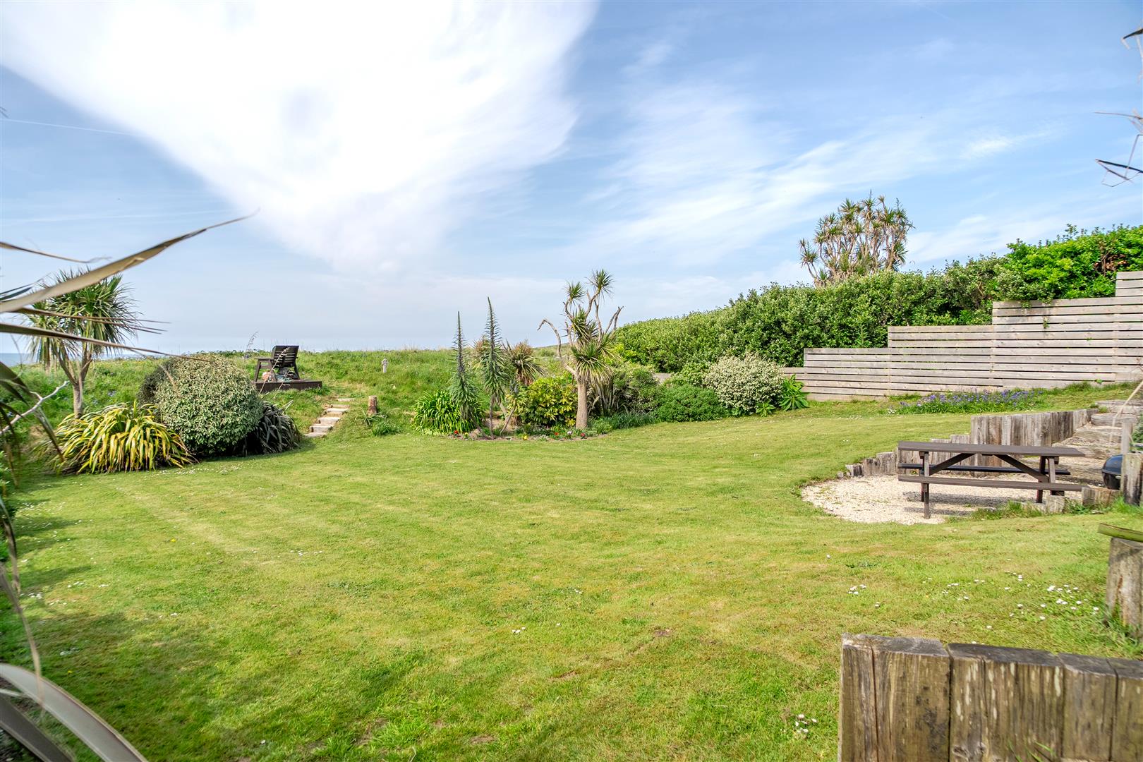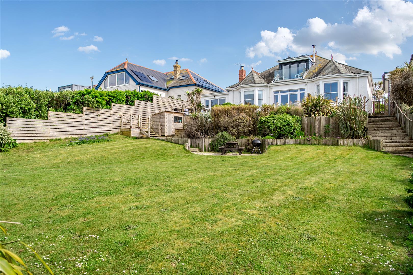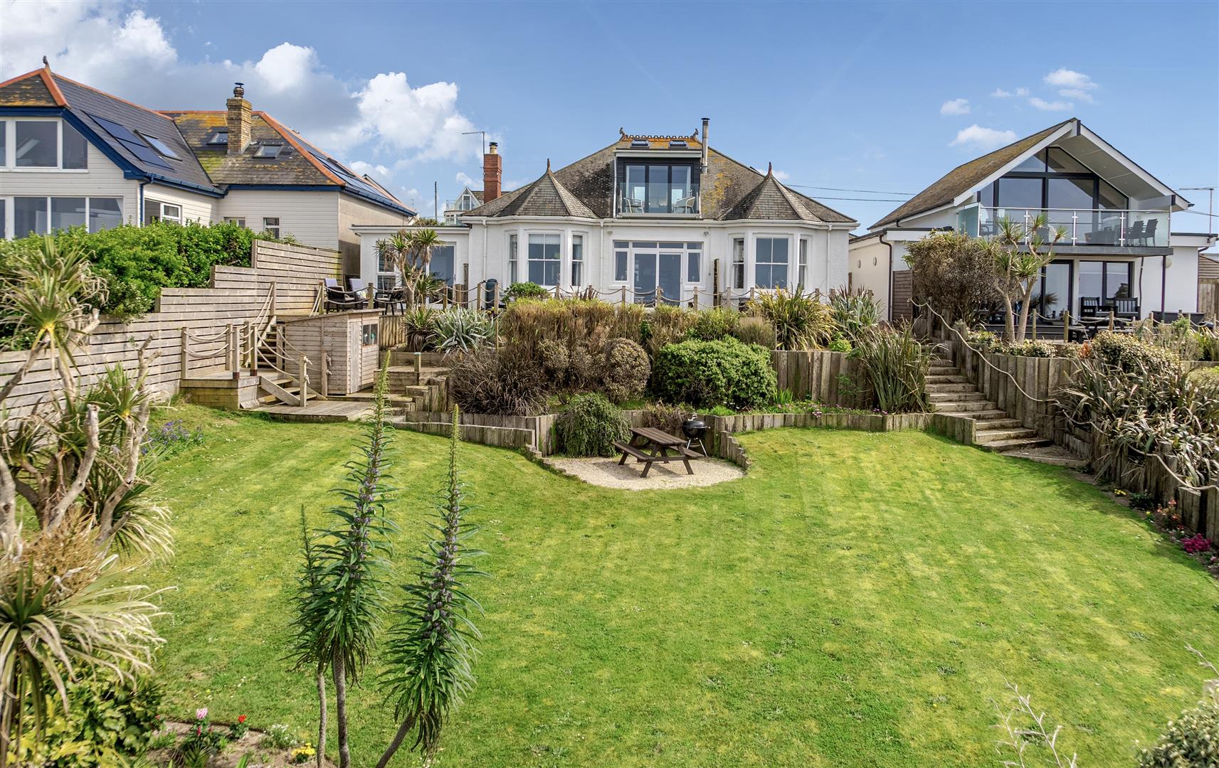 The westerly-facing seaward gardens and decked terrace create a truly special setting, with sweeping coastal views, lawned areas for relaxation and recreation, and a private gate leading directly to the beach