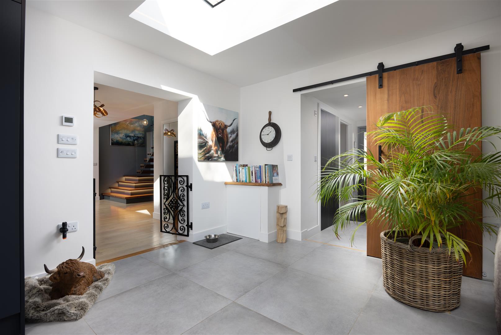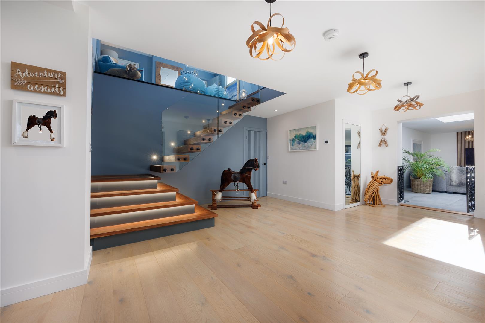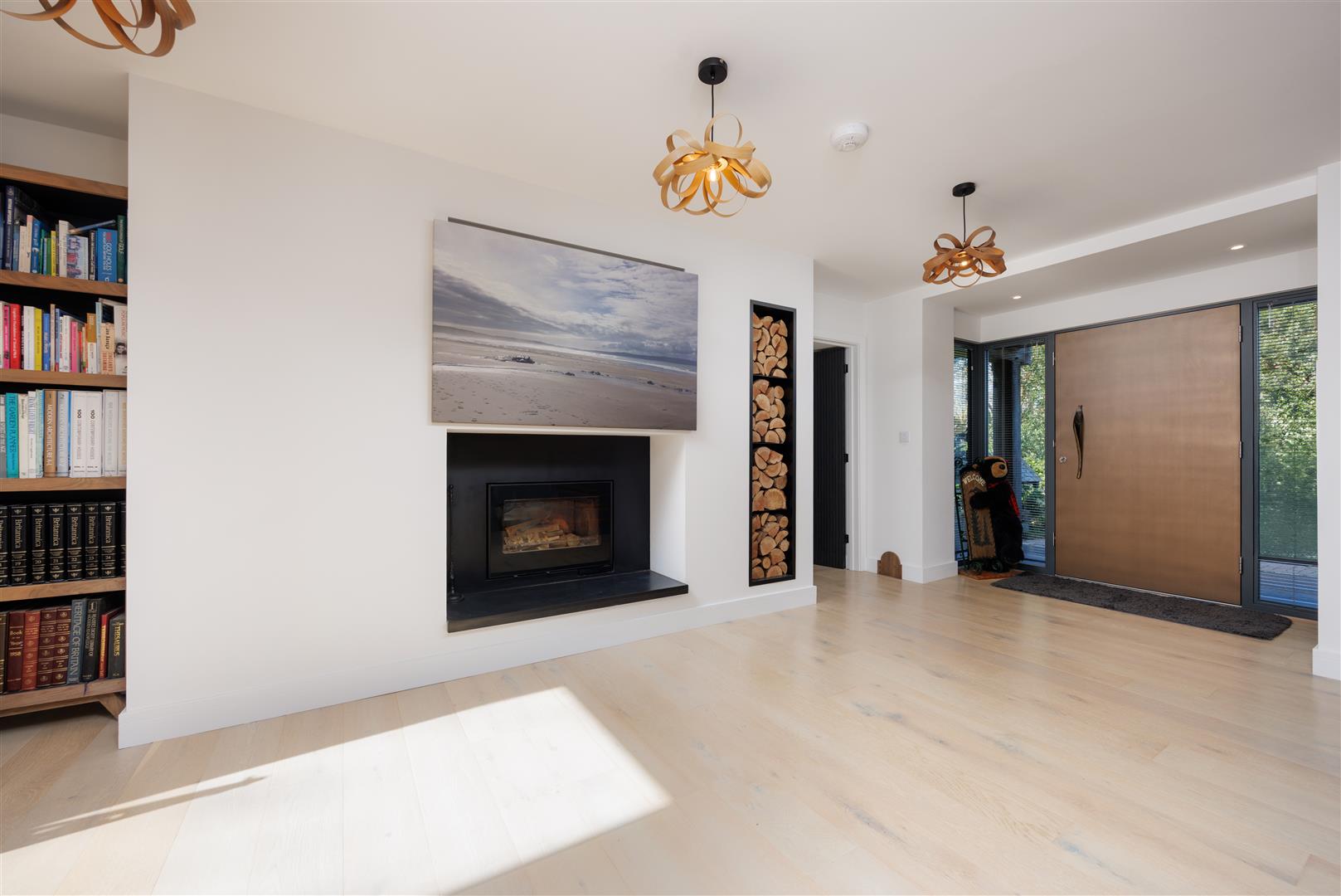 The spacious entrance hall provides a striking introduction to the house and immediately sets the tone for the contemporary interior. Featuring walnut wooden treads and a glass balustrade, the cantilevered staircase creates a superb architectural focal point. There is also a back-to-back fireplace, along with cleverly designed hidden doors which discreetly conceal useful storage spaces.