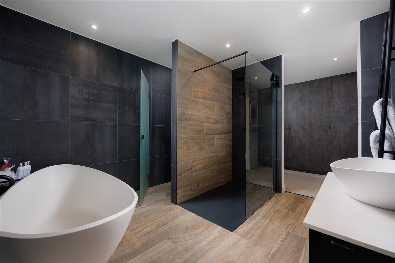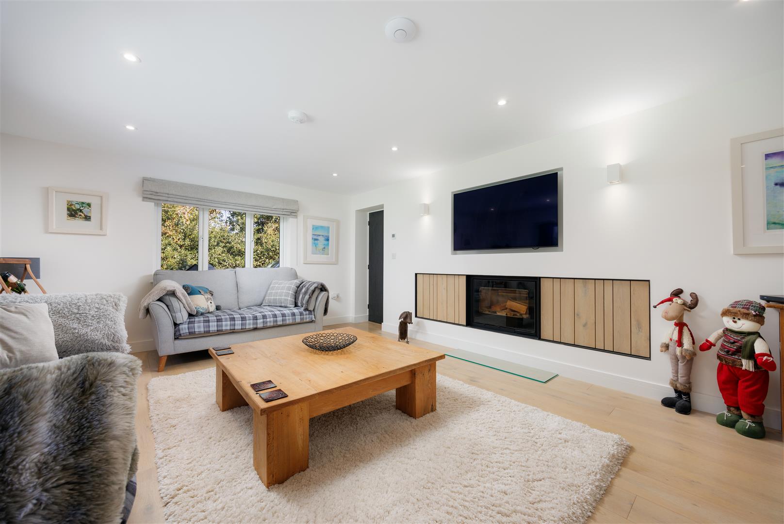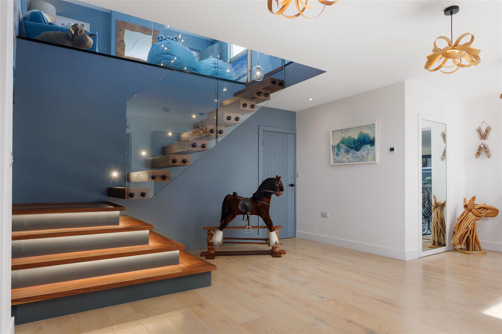 The spacious entrance hall provides a striking introduction to the house and immediately sets the tone for the contemporary interior. Featuring walnut wooden treads and a glass balustrade, the cantilevered staircase creates a superb architectural focal point. There is also a back-to-back fireplace, along with cleverly designed hidden doors which discreetly conceal useful storage spaces.