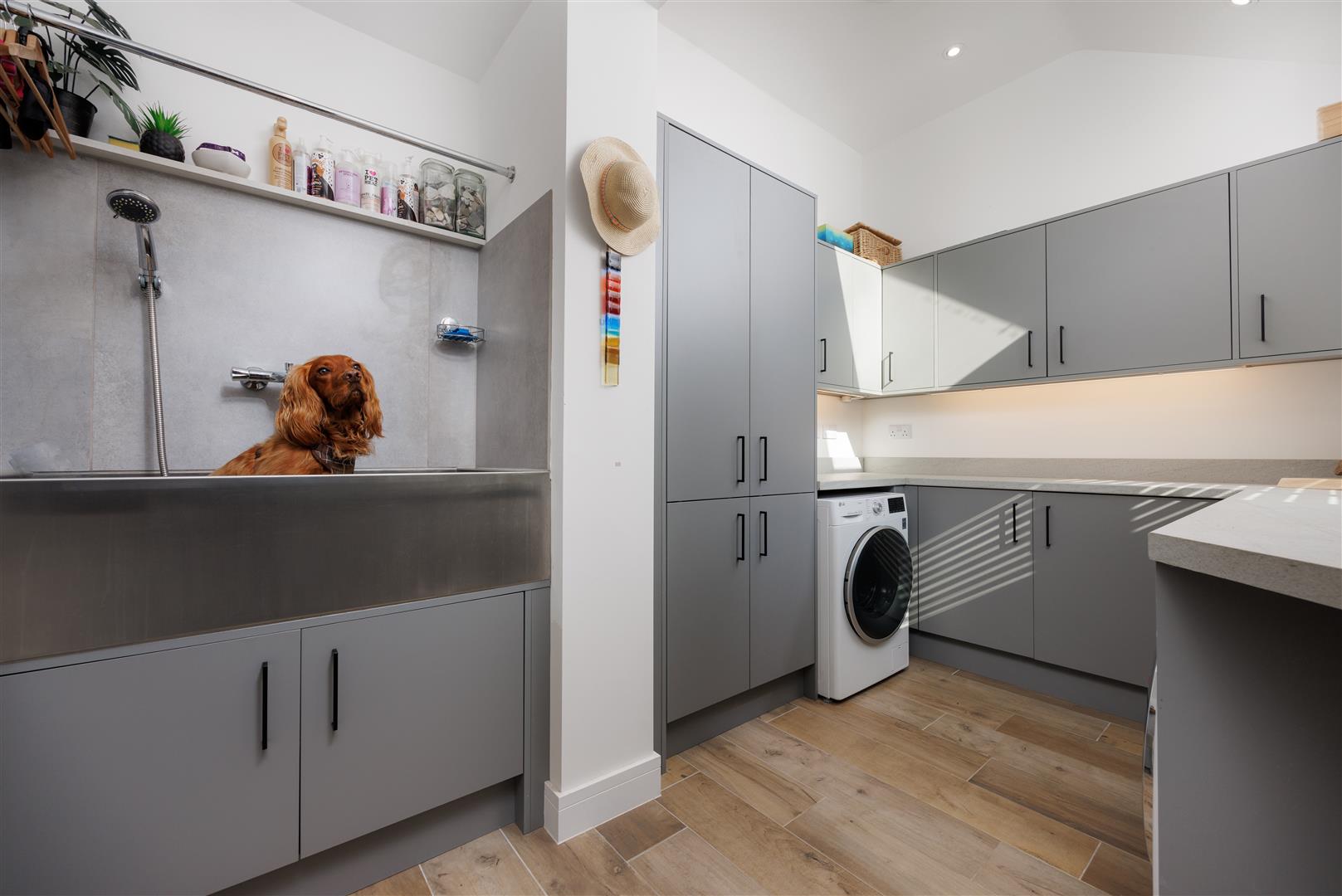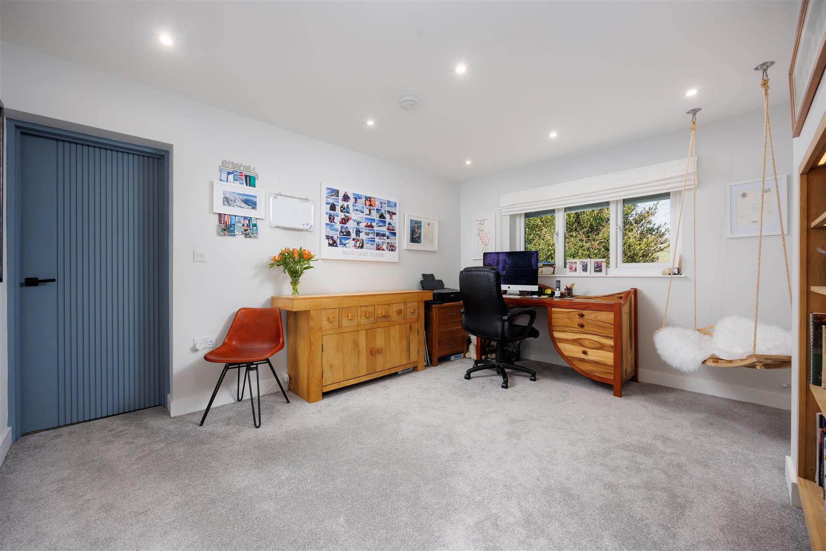 The remainder of the ground floor offers excellent versatility, including a spacious lounge providing a more formal reception space. This room also features the opposite side of the striking back-to-back fireplace, which forms a design feature shared with the entrance hall. Two further rooms can be utilised as bedrooms if required, with one currently arranged as a study or home office. The presence of a ground floor bedroom and bathroom facilities creates an ideal arrangement for multi-generational living, guests or those seeking single-level accommodation. A well-appointed utility room and cloakroom complete the practical elements of the ground floor accommodation.