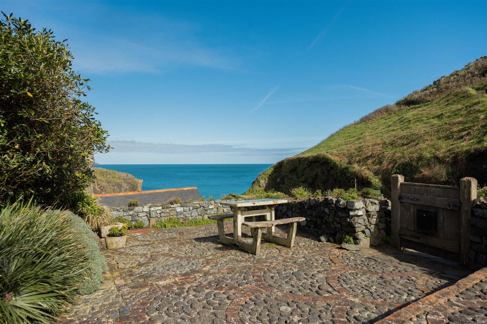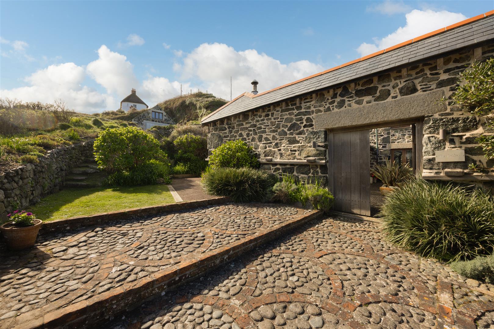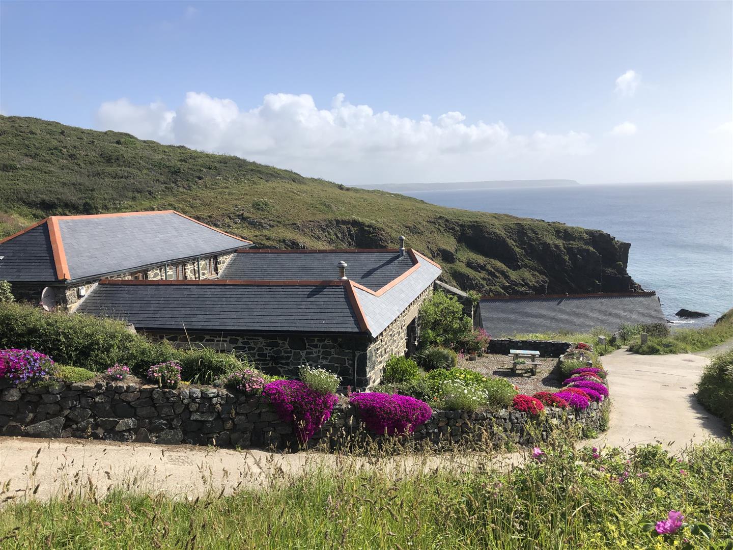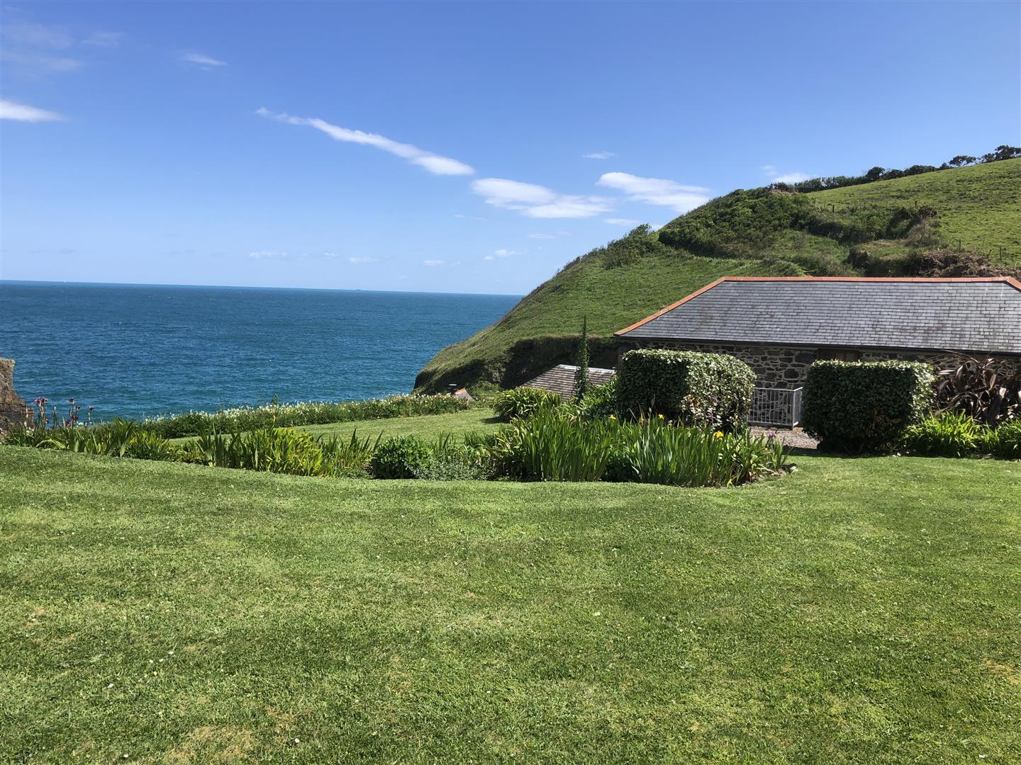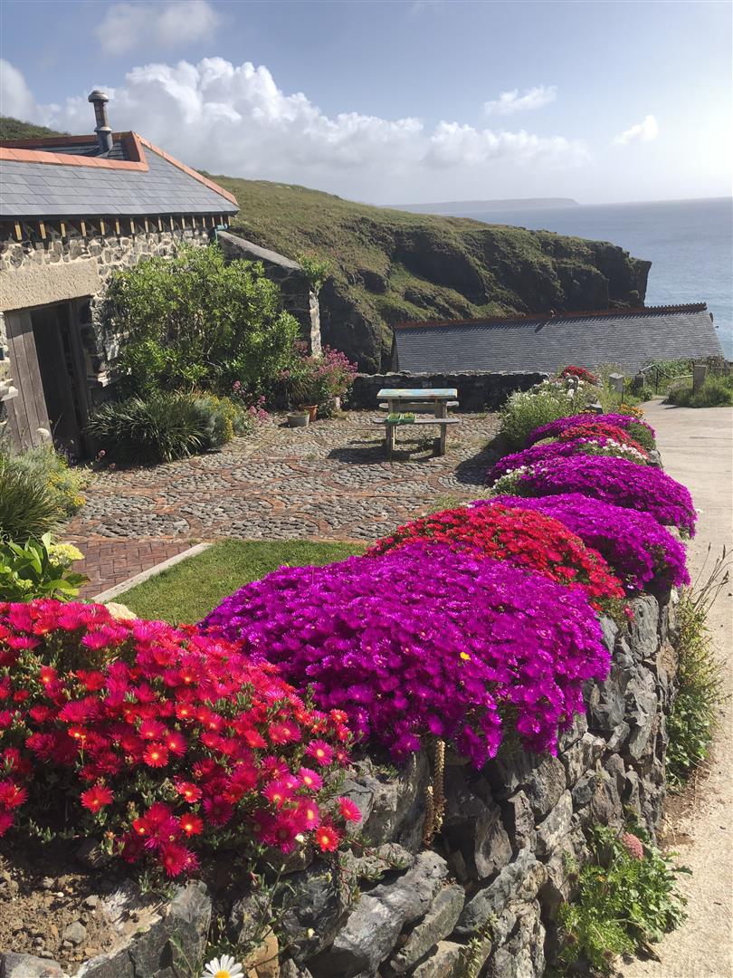 The gardens are arranged to the rear on a slightly elevated terrace, providing a degree of shelter and separation from the cove while retaining open views towards the coastline. A further courtyard area connects externally to the first floor, offering an additional access point and usable outdoor space. The property also includes a dedicated parking area within Church Cove, a practical provision in a location where parking is otherwise limited.