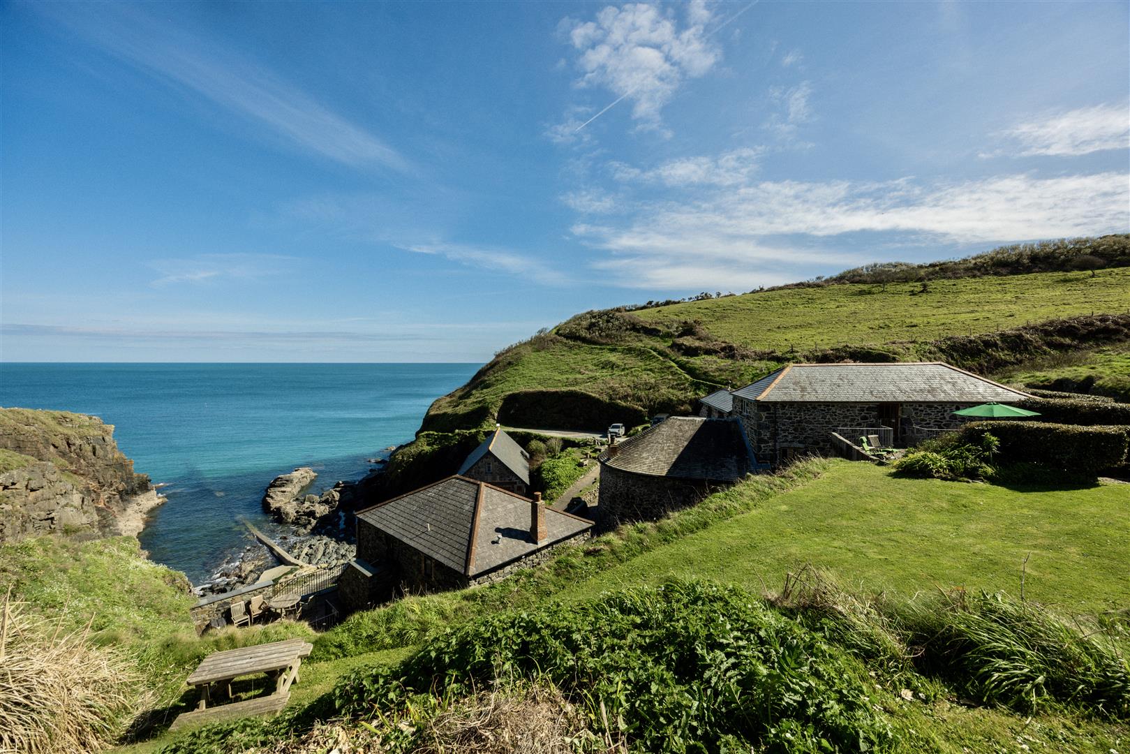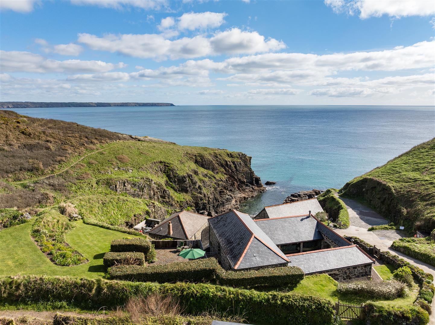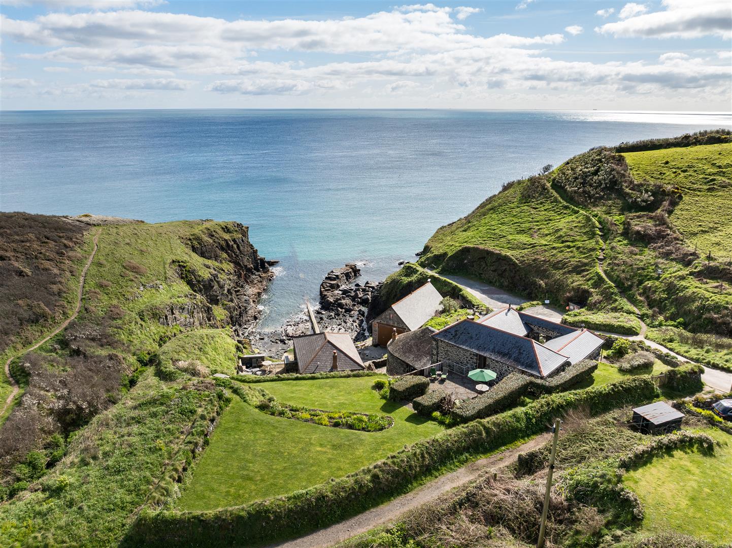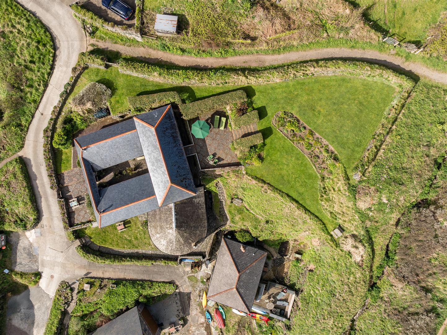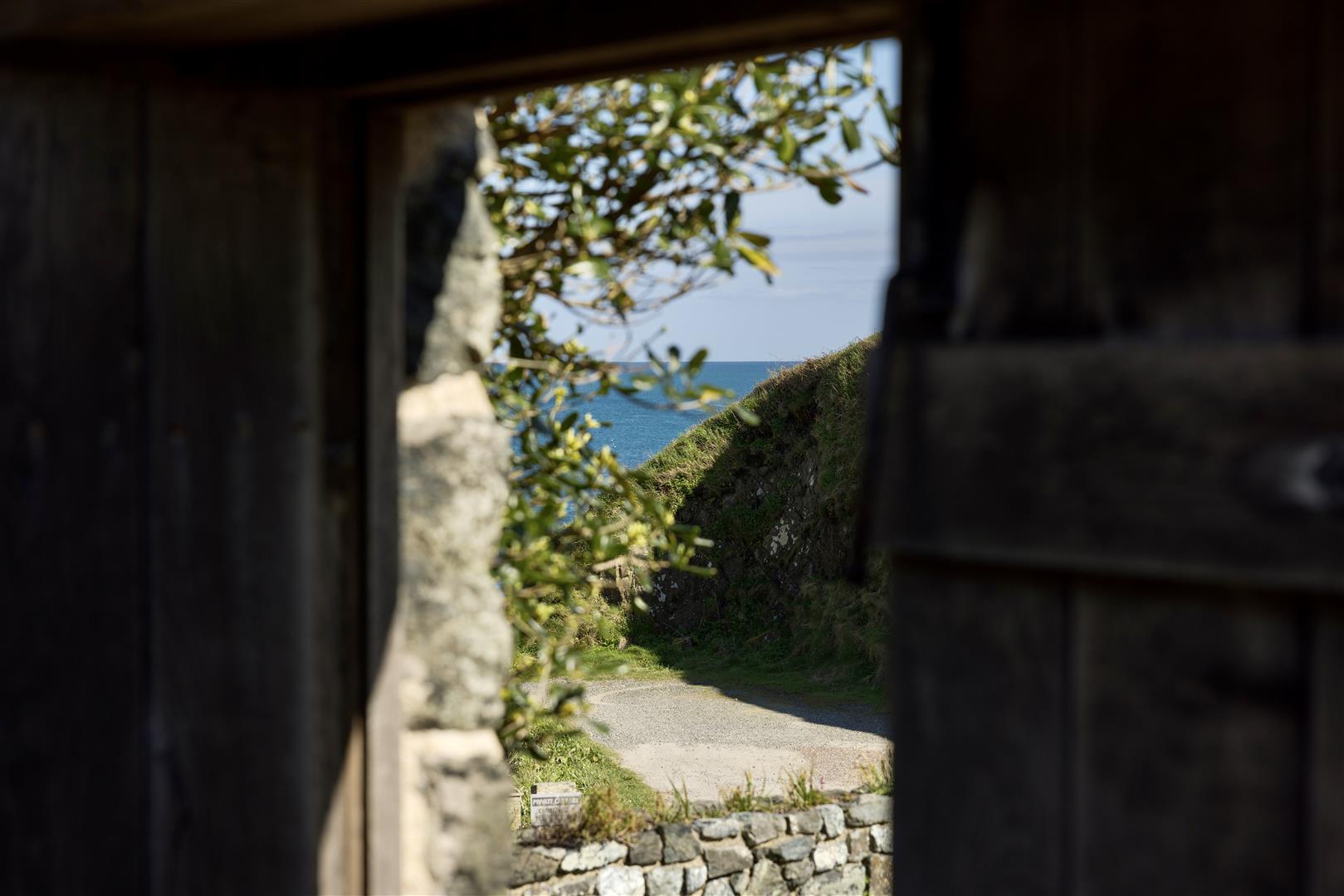 The gardens are arranged to the rear on a slightly elevated terrace, providing a degree of shelter and separation from the cove while retaining open views towards the coastline. A further courtyard area connects externally to the first floor, offering an additional access point and usable outdoor space. The property also includes a dedicated parking area within Church Cove, a practical provision in a location where parking is otherwise limited.