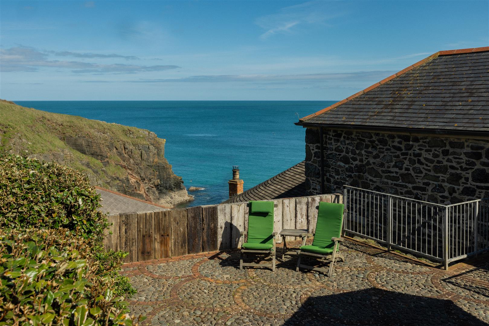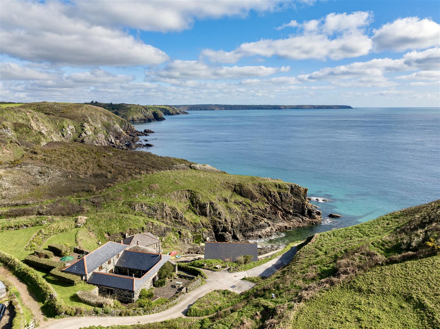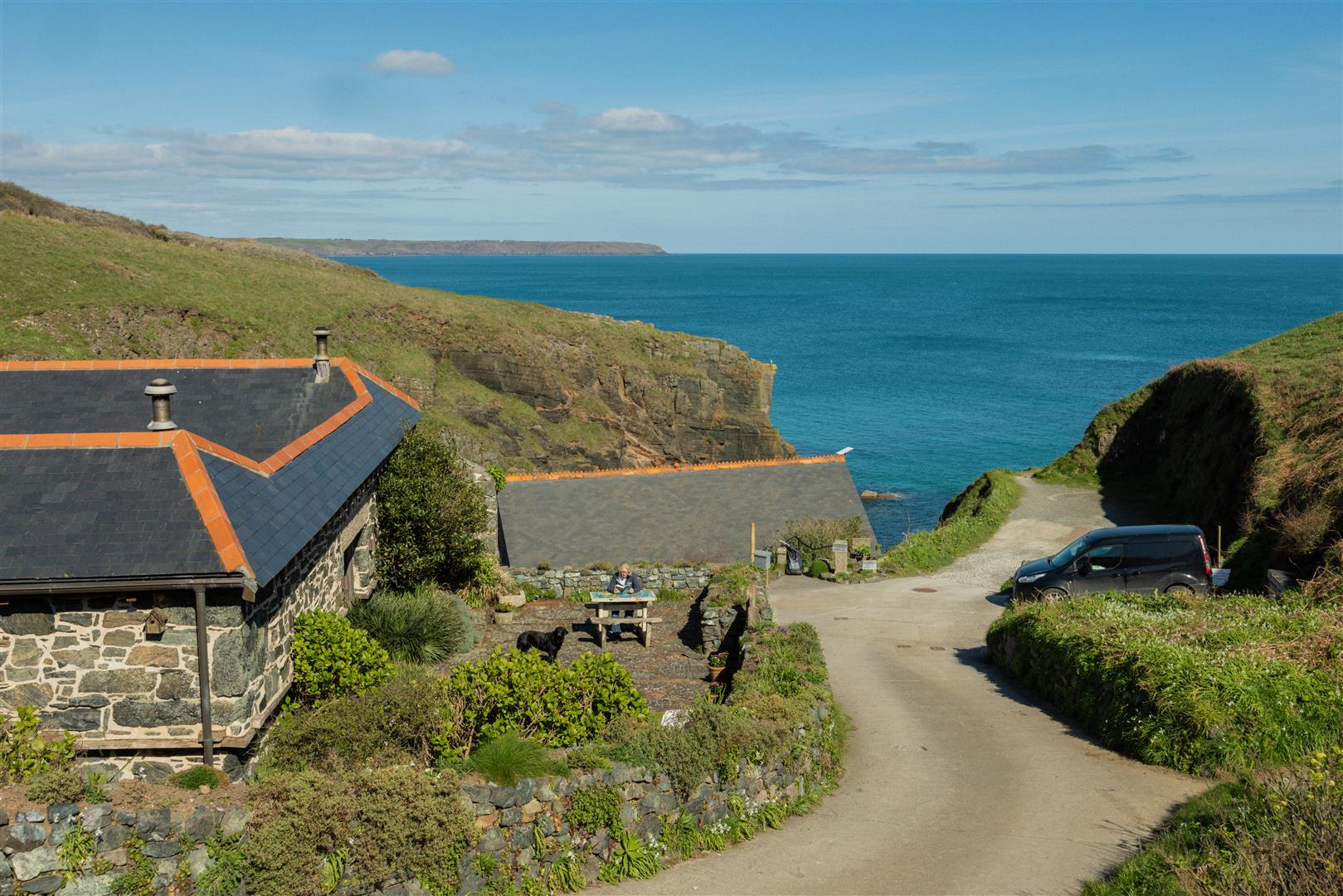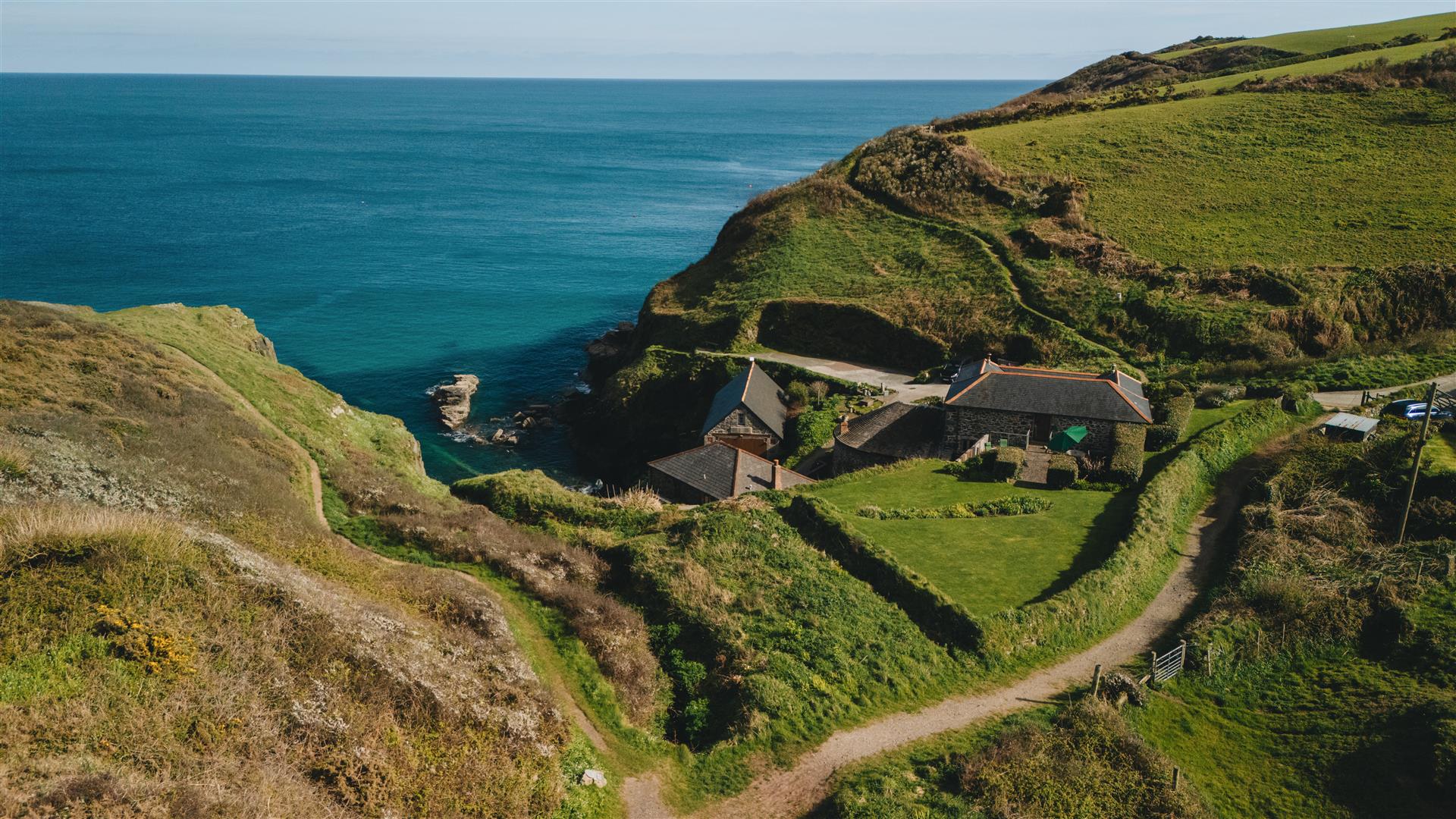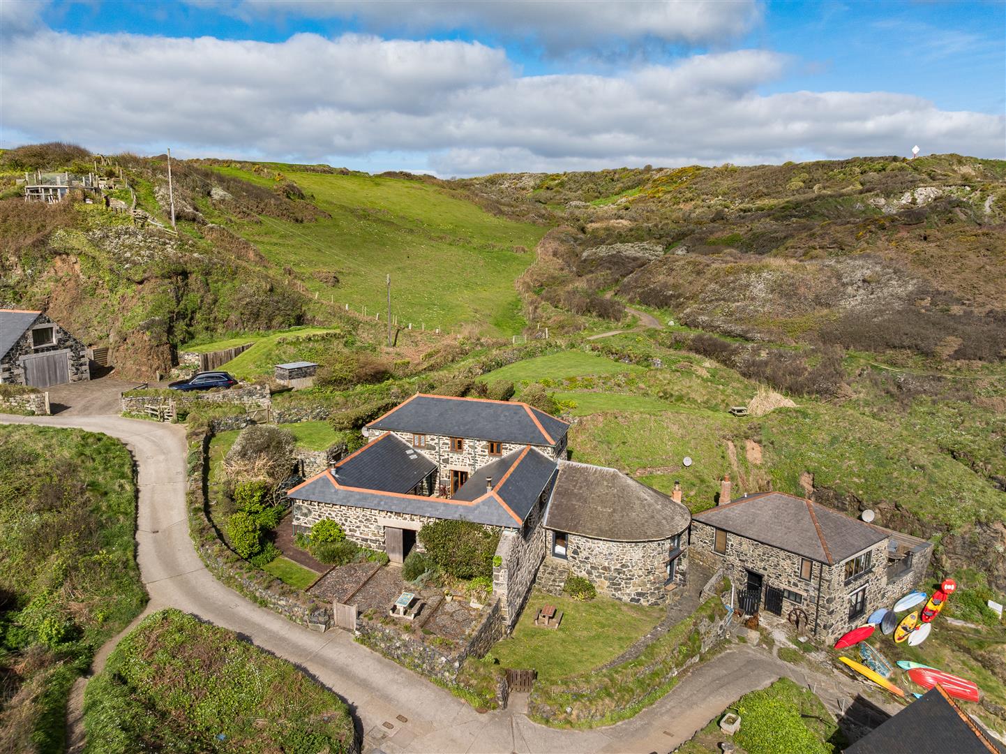 The gardens are arranged to the rear on a slightly elevated terrace, providing a degree of shelter and separation from the cove while retaining open views towards the coastline. A further courtyard area connects externally to the first floor, offering an additional access point and usable outdoor space. The property also includes a dedicated parking area within Church Cove, a practical provision in a location where parking is otherwise limited.