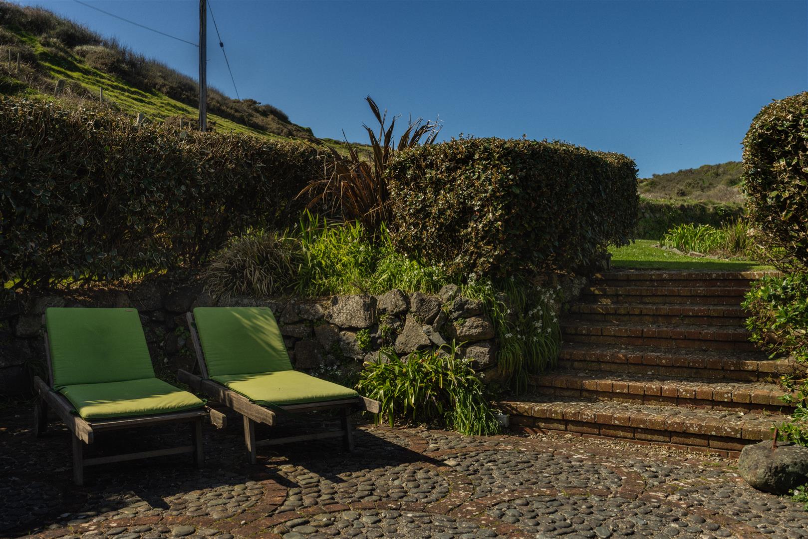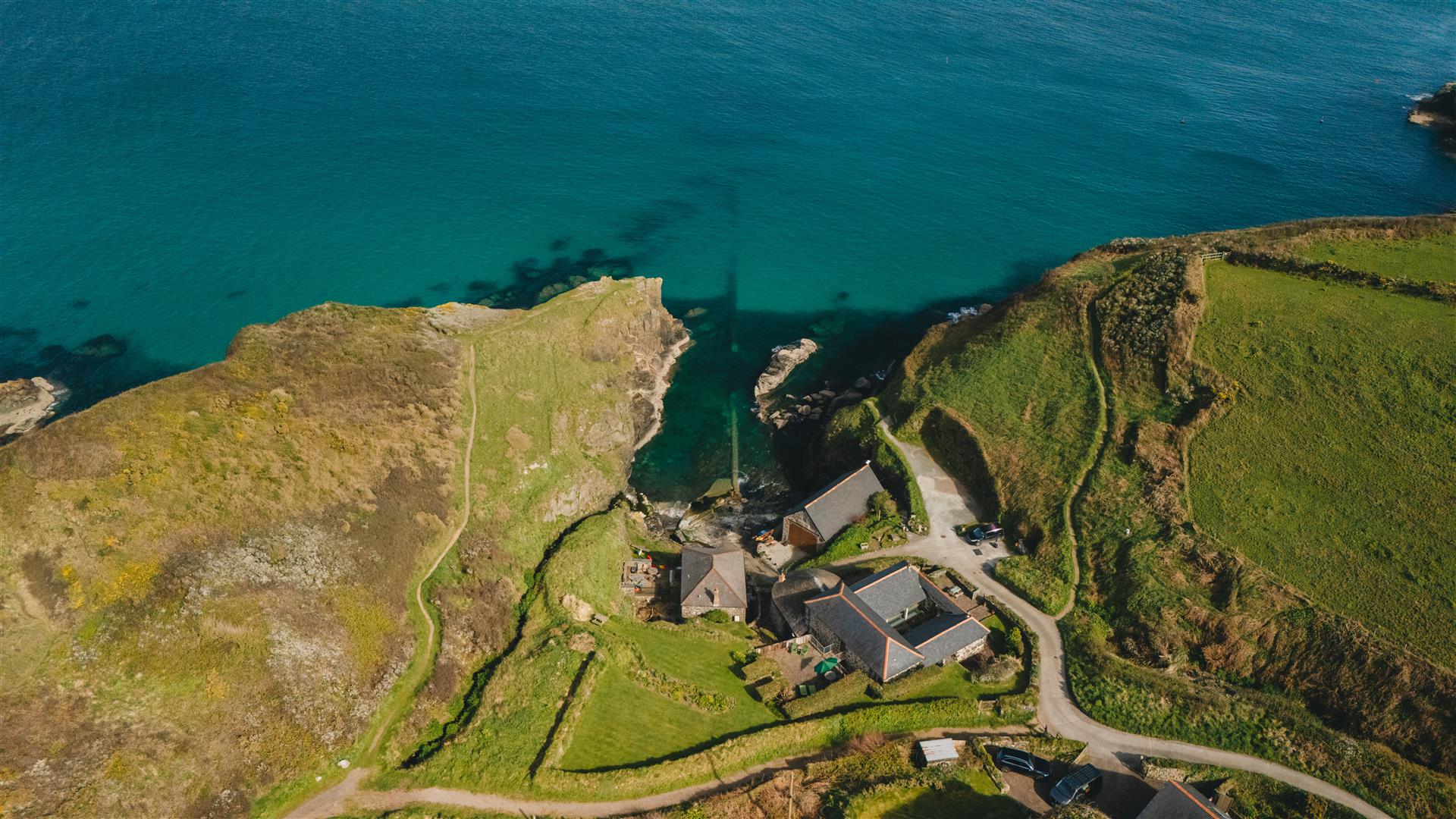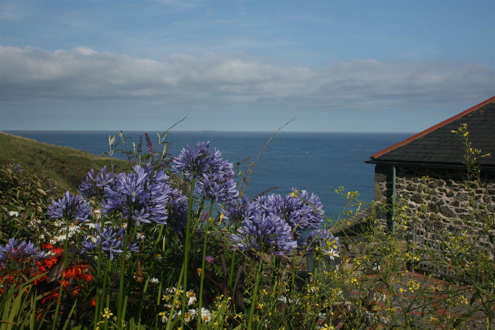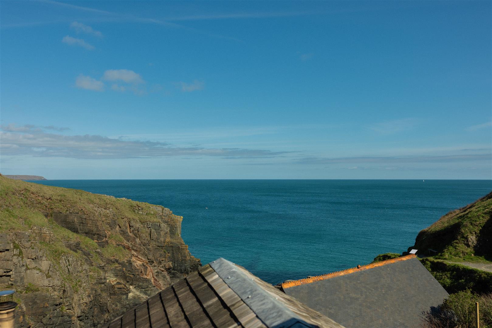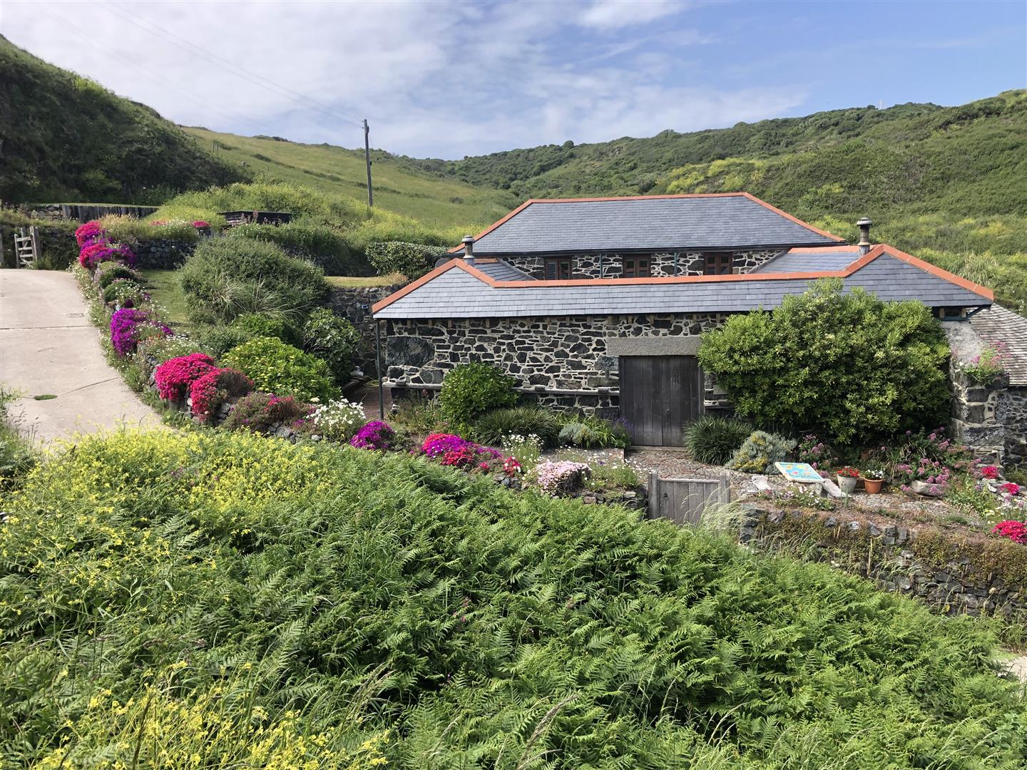 The gardens are arranged to the rear on a slightly elevated terrace, providing a degree of shelter and separation from the cove while retaining open views towards the coastline. A further courtyard area connects externally to the first floor, offering an additional access point and usable outdoor space. The property also includes a dedicated parking area within Church Cove, a practical provision in a location where parking is otherwise limited.