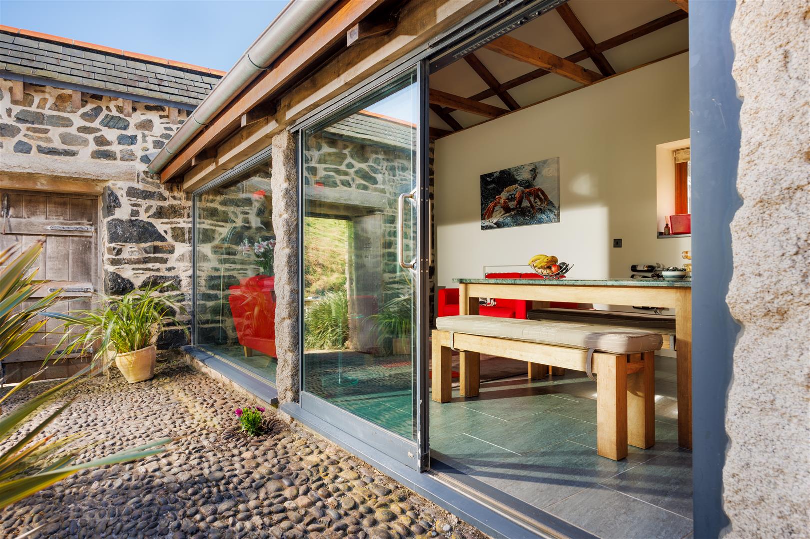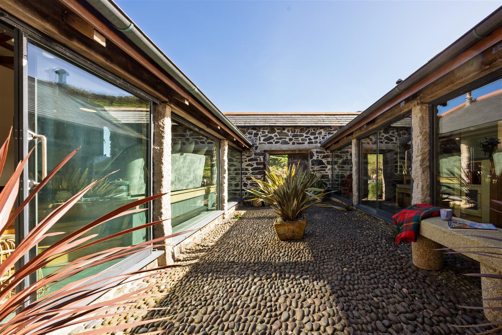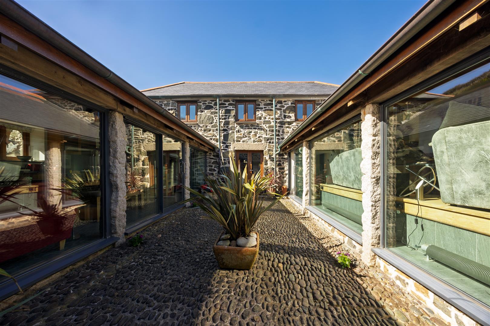 Access is through substantial double doors into a central cobbled passage, forming a sheltered courtyard spine through the building. This walkway retains its original stonework and serpentine granite, now framed on both sides by full-width glazing which defines the principal living spaces and draws light deep into the plan. The contrast between the retained fabric and modern intervention is consistent and deliberate.