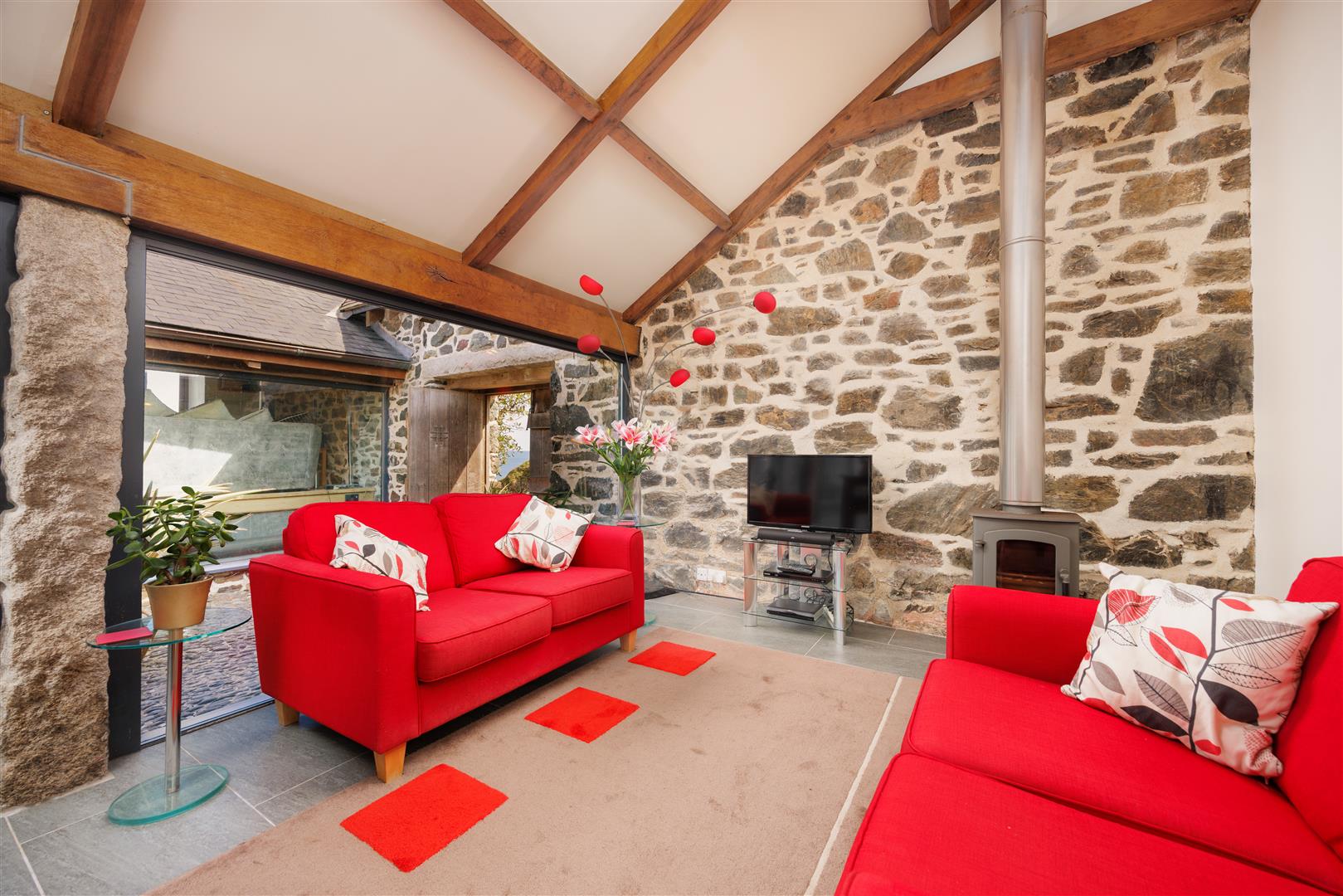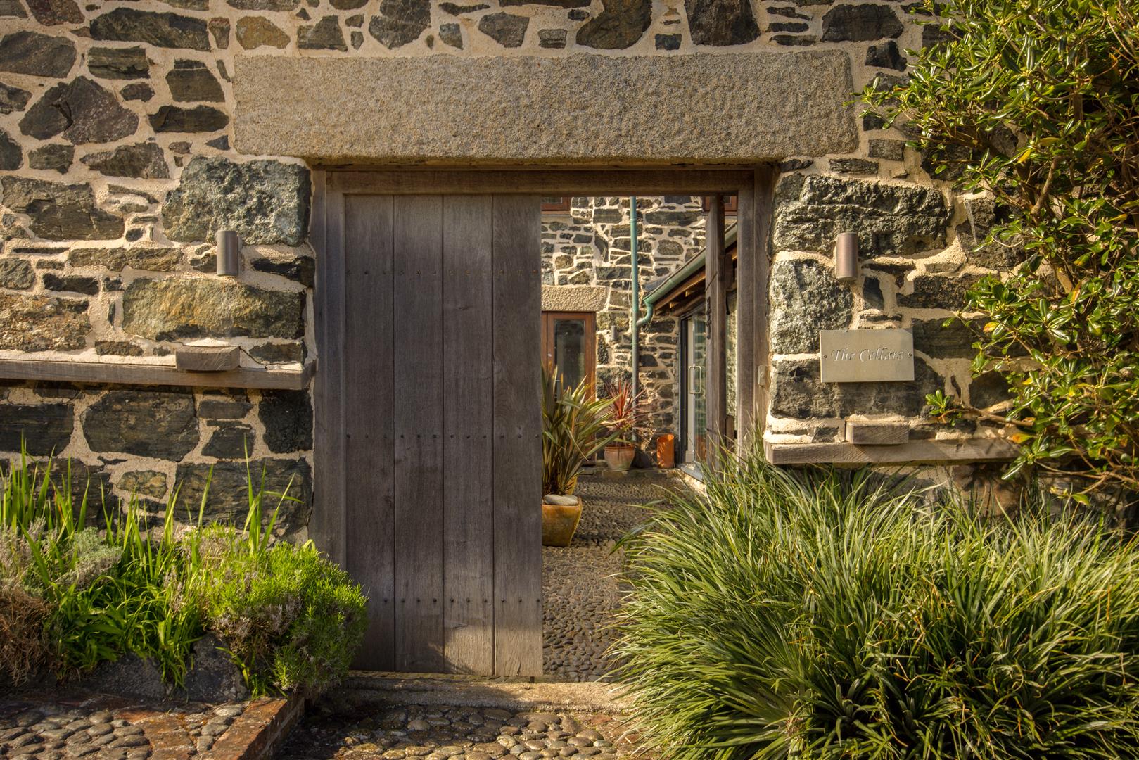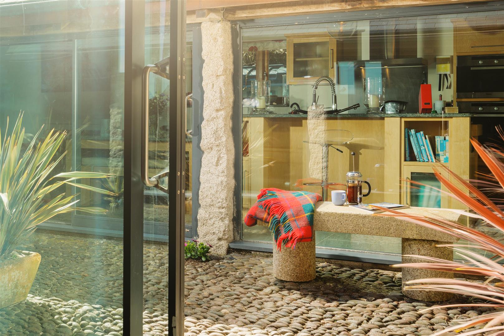 Access is through substantial double doors into a central cobbled passage, forming a sheltered courtyard spine through the building. This walkway retains its original stonework and serpentine granite, now framed on both sides by full-width glazing which defines the principal living spaces and draws light deep into the plan. The contrast between the retained fabric and modern intervention is consistent and deliberate.