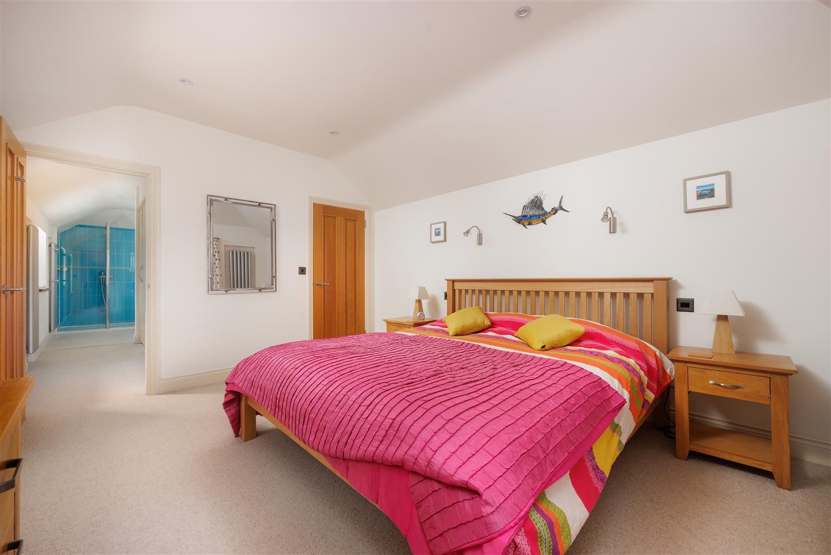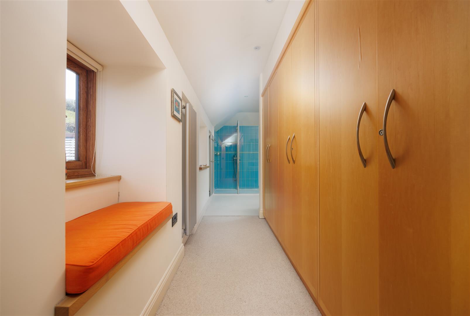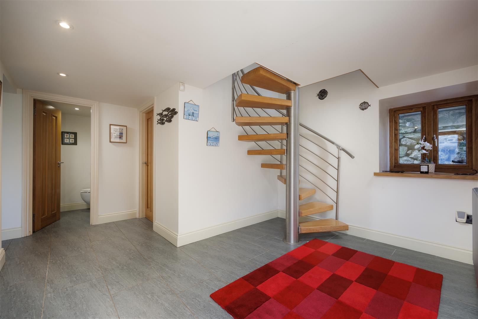 To the rear of the ground floor is a guest bedroom, positioned for privacy, with an adjacent shower room. A separate WC and a utility room provide practical support spaces on this level, allowing for independent guest use if required.