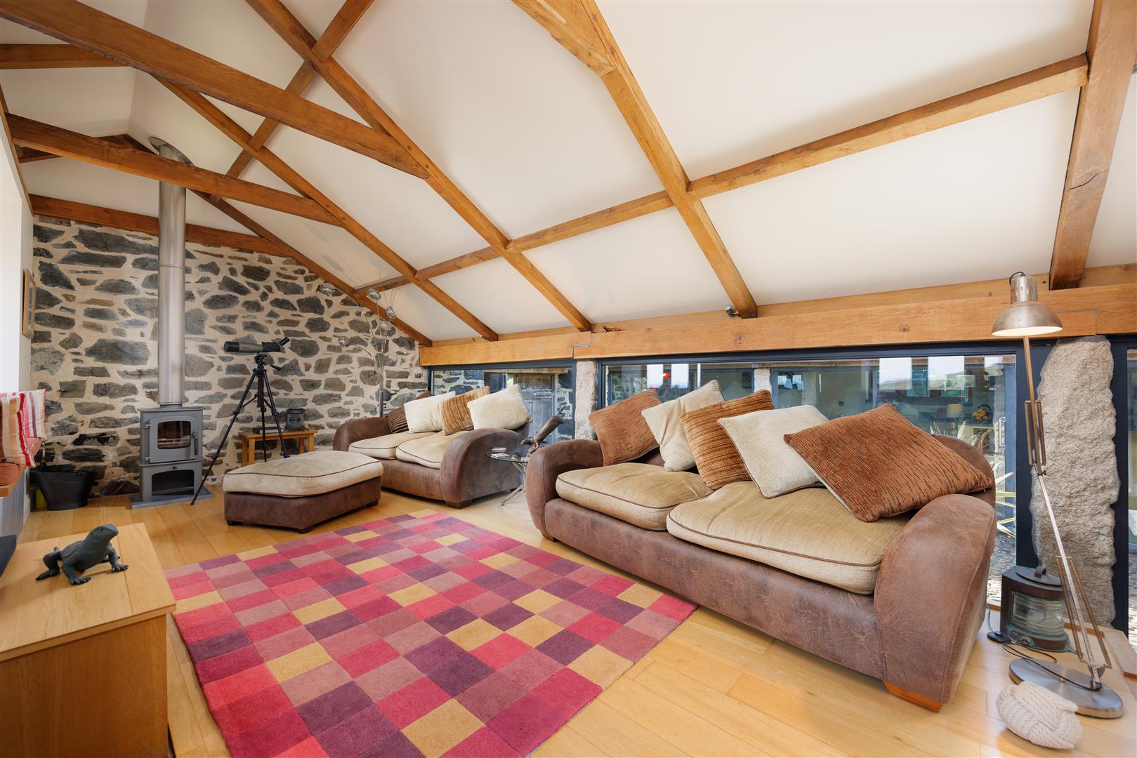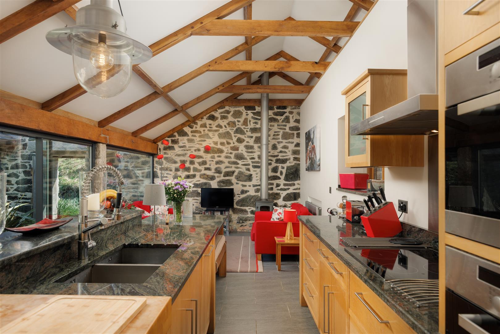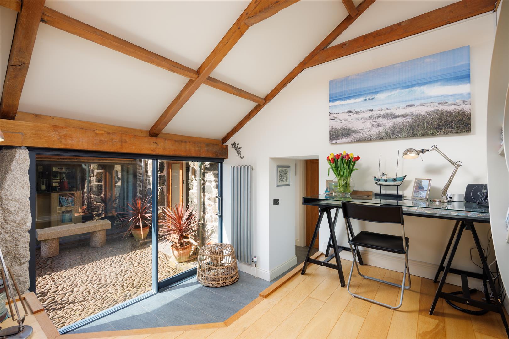 On the seaward side, the sitting room measures approximately 23’5 by 11’, with exposed joists and beams and a wood-burning stove set as a focal point. The room is oriented towards the cove, with direct views to the sea. Opposite, across the glazed courtyard, the kitchen and dining room mirrors the proportions. Here, a vaulted ceiling increases volume, and full-height glazing opens the space to the courtyard while maintaining visual connection through the building.