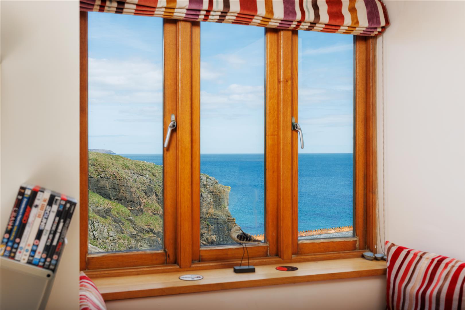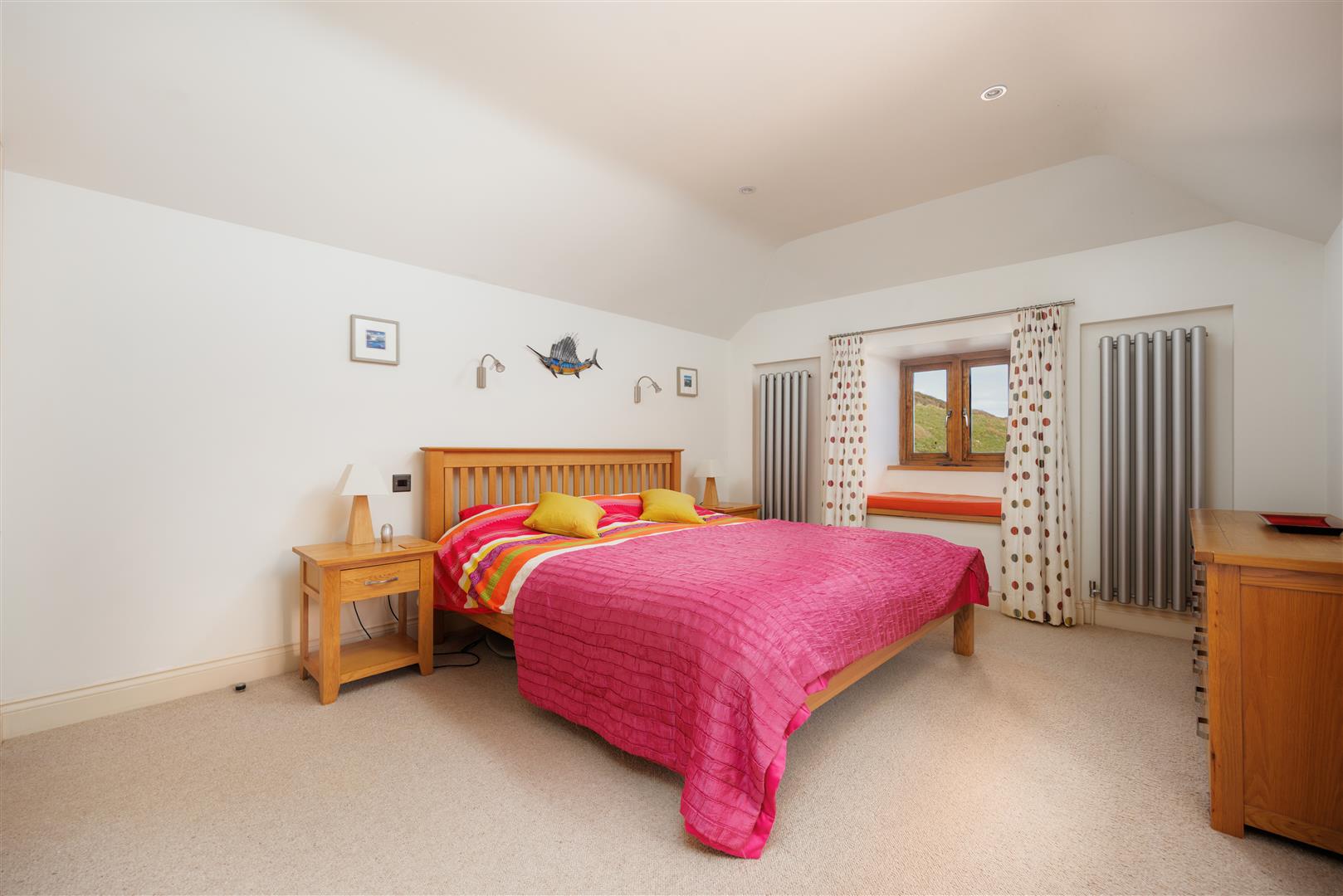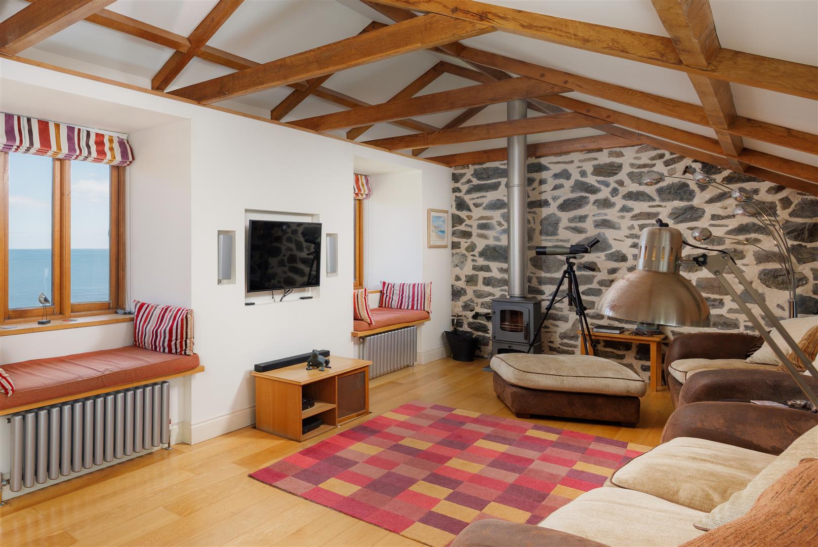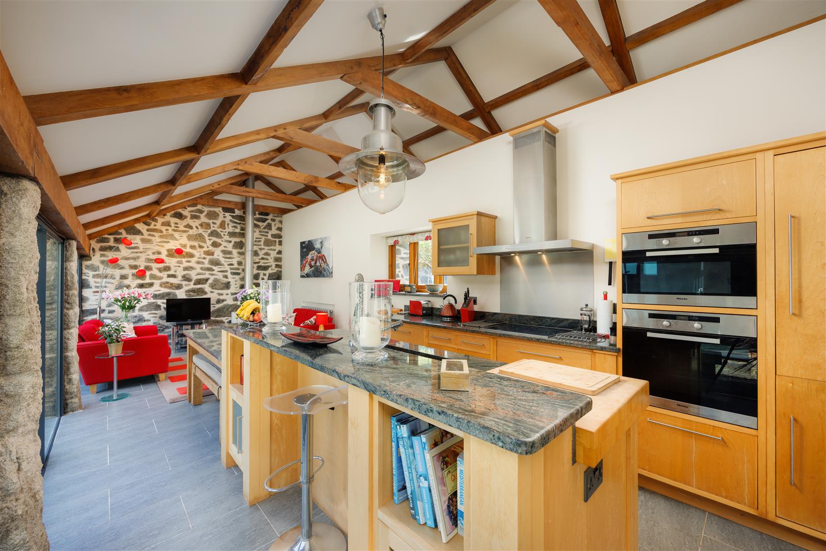 On the seaward side, the sitting room measures approximately 23’5 by 11’, with exposed joists and beams and a wood-burning stove set as a focal point. The room is oriented towards the cove, with direct views to the sea. Opposite, across the glazed courtyard, the kitchen and dining room mirrors the proportions. Here, a vaulted ceiling increases volume, and full-height glazing opens the space to the courtyard while maintaining visual connection through the building.